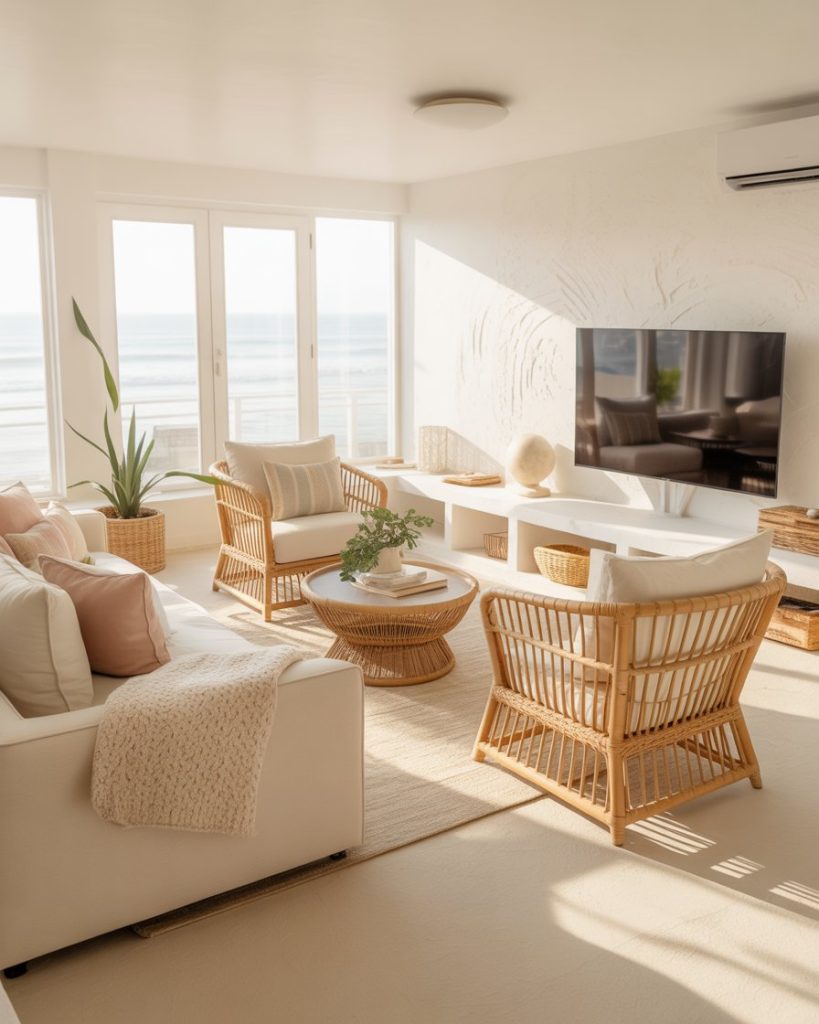 A coastal accent wall painted in light textured tones such as seafoam, ivory, or sand will automatically instill a sense of calm, much like the beach. Application of limewash or plaster would give a little softness to the depth. Behind the TV or a couch, this is perfect. It emanates ease and freshness.
