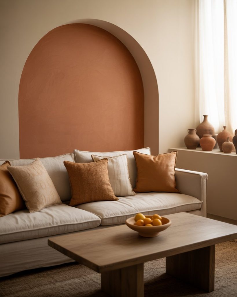 Curves just naturally soften spaces. Use painted arches in blush, beige, or sage from farmhouse ideas paint color palettes to create dimension. Behind a fireplace or couch, this visual play will make for an elegant, custom feel.