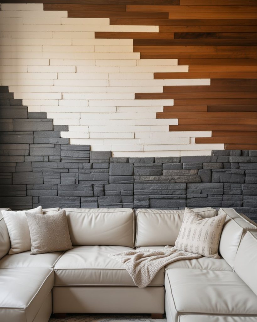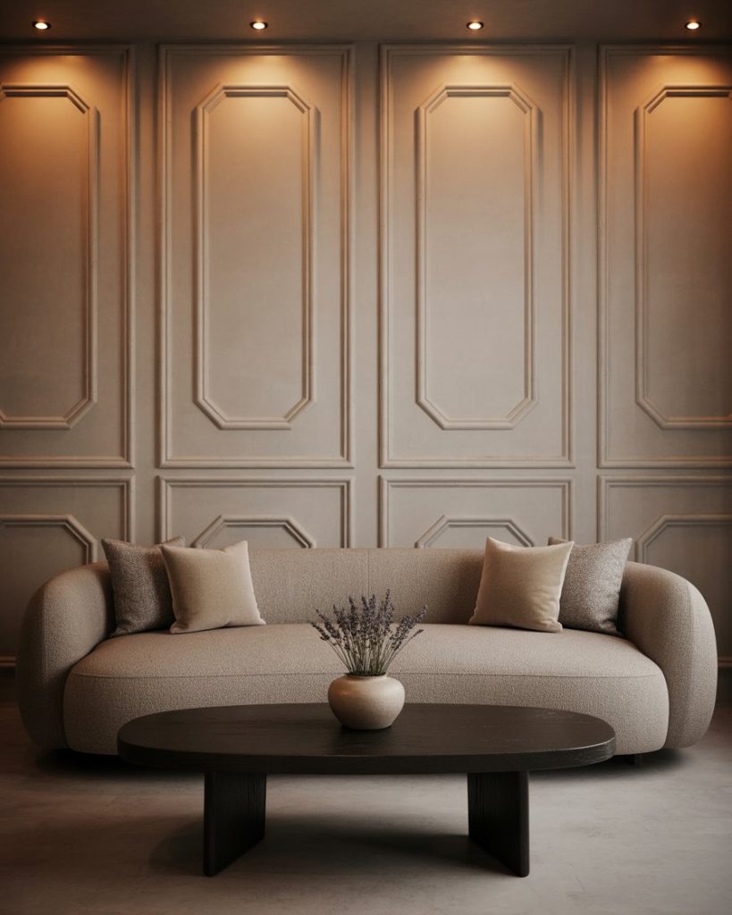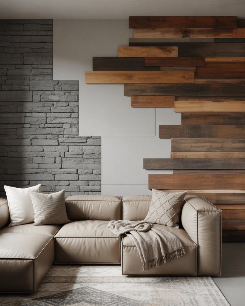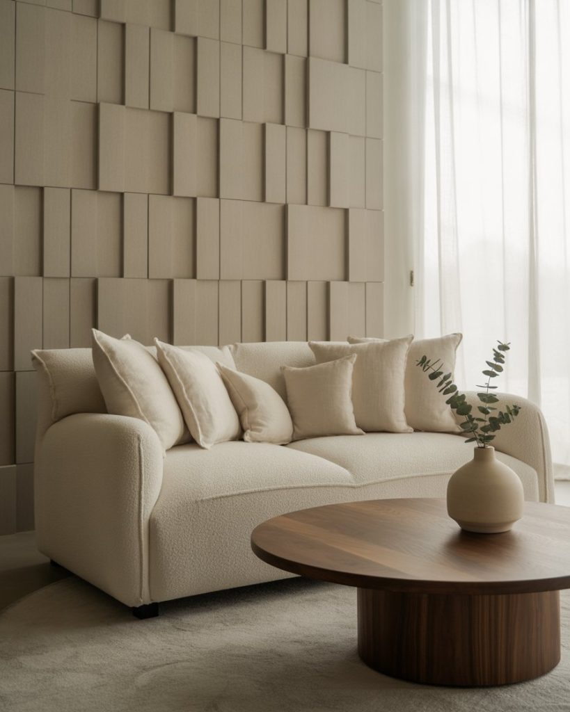 Play with light and shadow-use 3d-wall panels to achieve this effect. Choose a textured pattern, whether geometric or wave-like, in neutral tones beige, ivory, or gray. Behind the couch, they transform subtle forms into sculptures worthy of tactile warmth in modern living room accent walls.