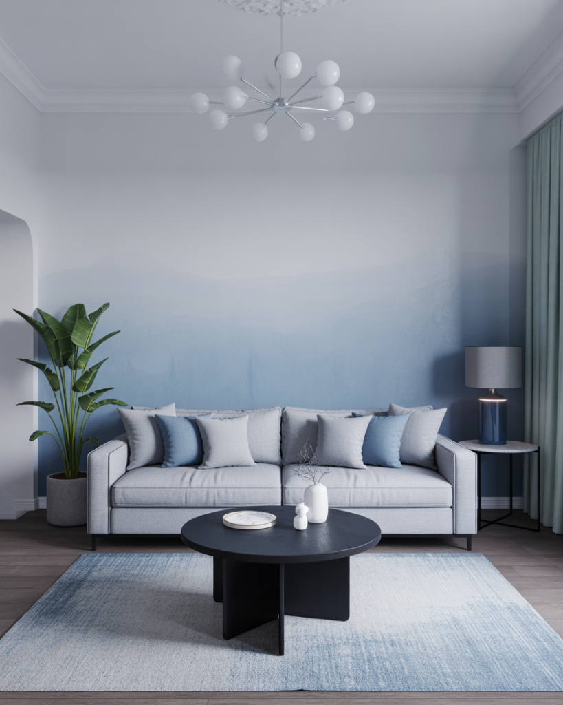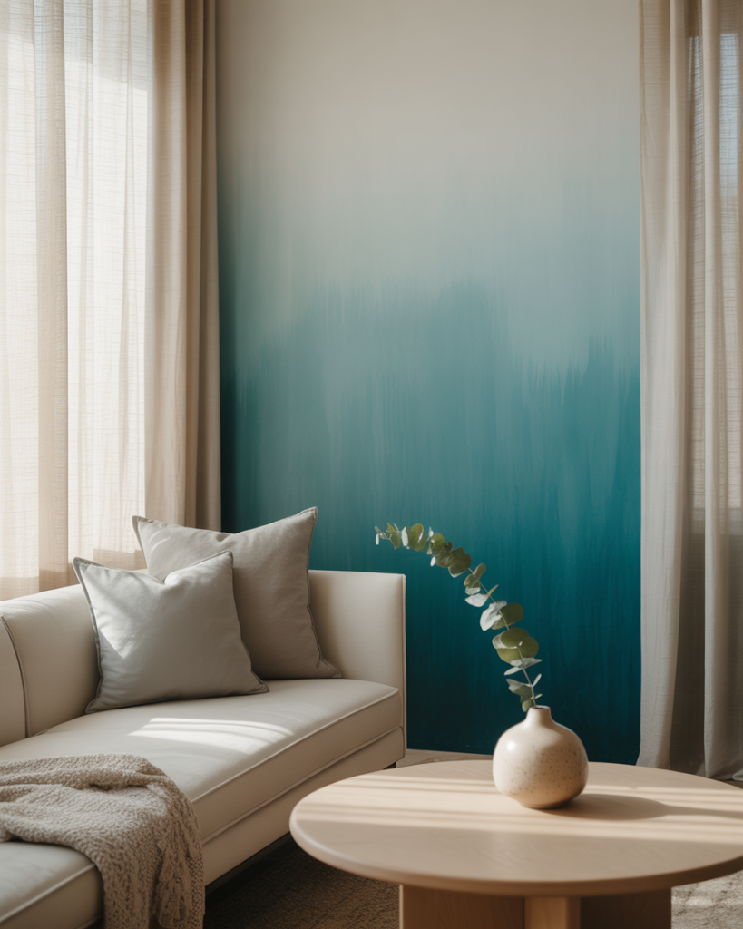 Ombre is a trend that brings a graceful flair to paint design. The blend of light and dark shades of blue, peach, or gray lends a softness and flow to the space. Placed behind a TV or couch, this fade gives a relaxing yet expressive feeling.