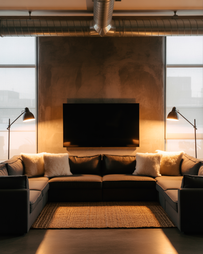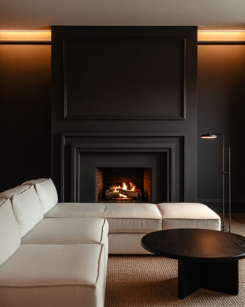 Concrete finishes bring the modern edge of raw authenticity. A textured gray wall behind your fireplace or Tv works well with black accents and simple decor. Warm lights and plush fabrics are best to offset the urban feel.