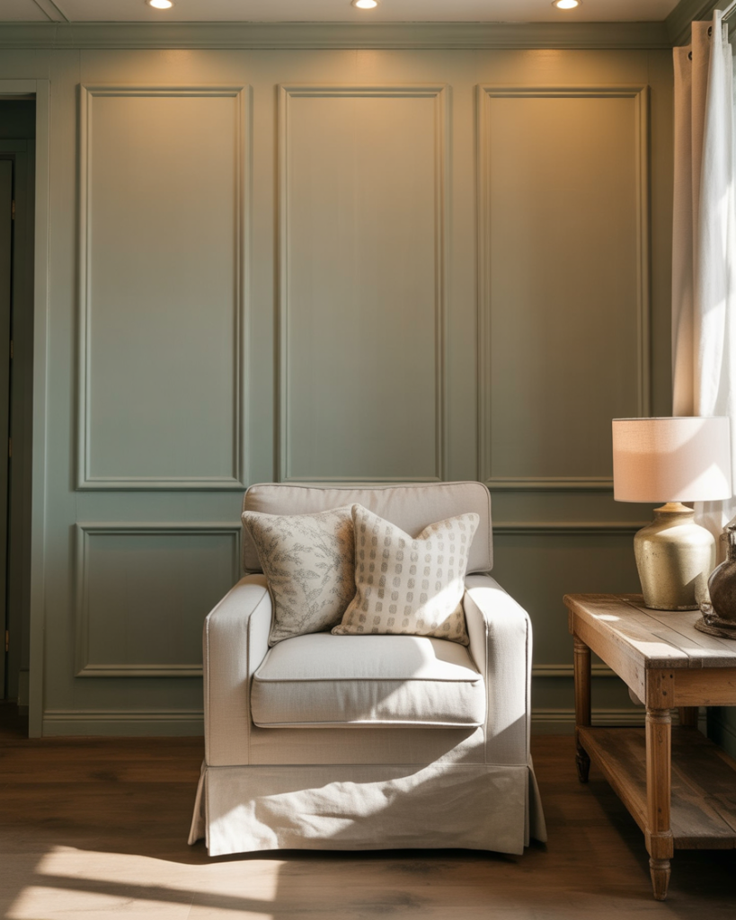 A wood wainscoted wall instantly adds structure and tradition. Painted in dusty green or muted navy, it feels refined yet homely. Ideal behind a couch or fireplace, it ties farmhouse grace with modern restraint.