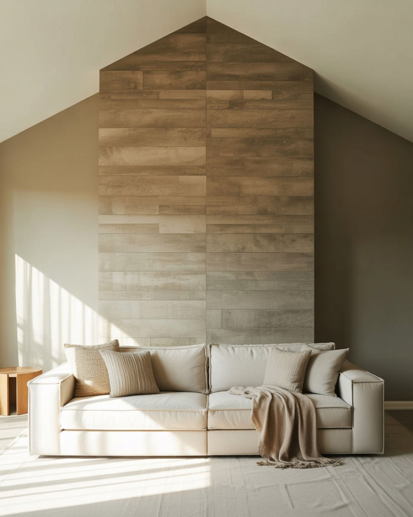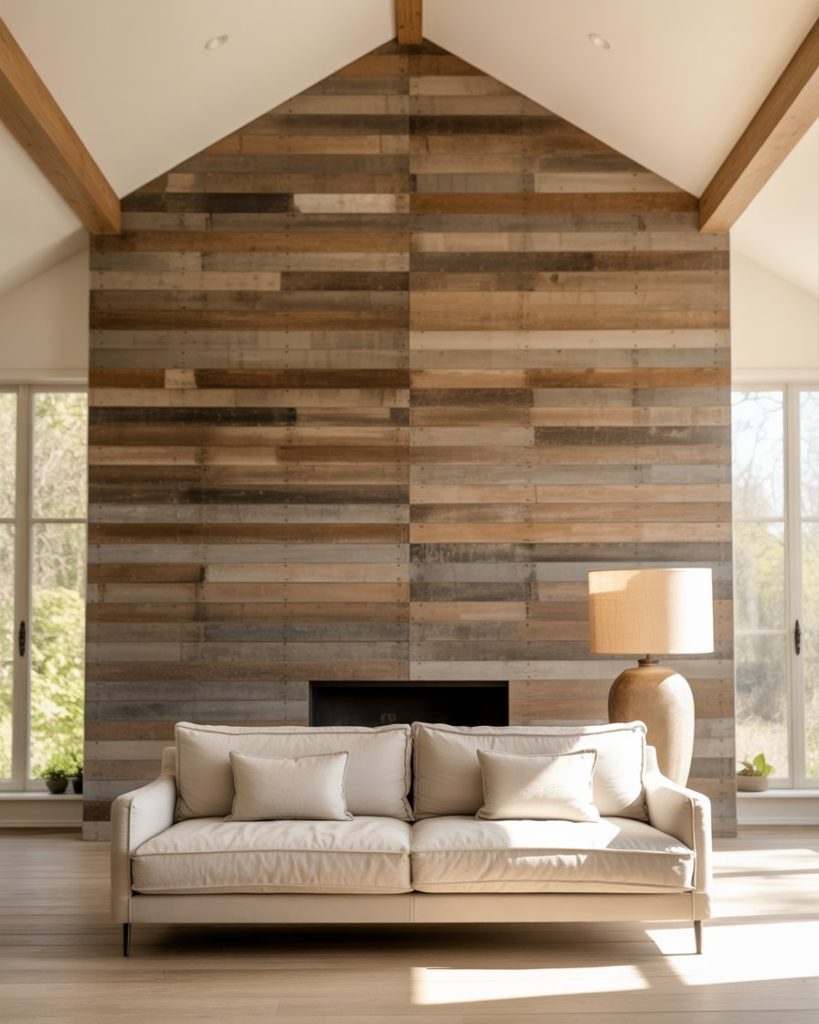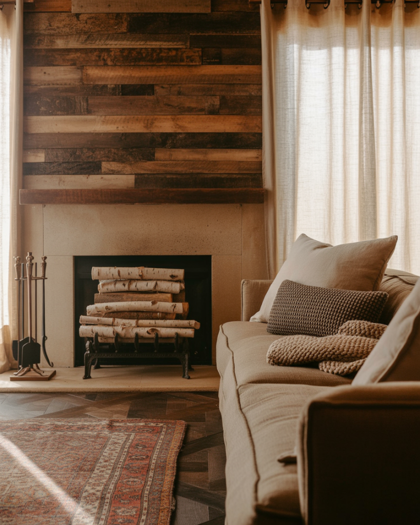 A wood accent wall adds heart and texture to any living space. Reclaimed planks or whitewash boards lend a great rustic feel, particularly behind the fireplace or Tv. Combine this with vintage-style décor, woven rugs, and colors from earth-tones to create a grounded yet inviting space.