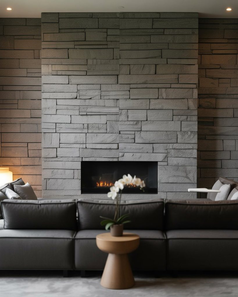 Stone veneer or casts are a wonderful end to timeless luxury. A stack stone or slate accent wall behind a fireplace or bathroom makes an architectural statement. Its natural textured surface pairs perfectly with minimalist décor, creating harmony between nature and modern design.