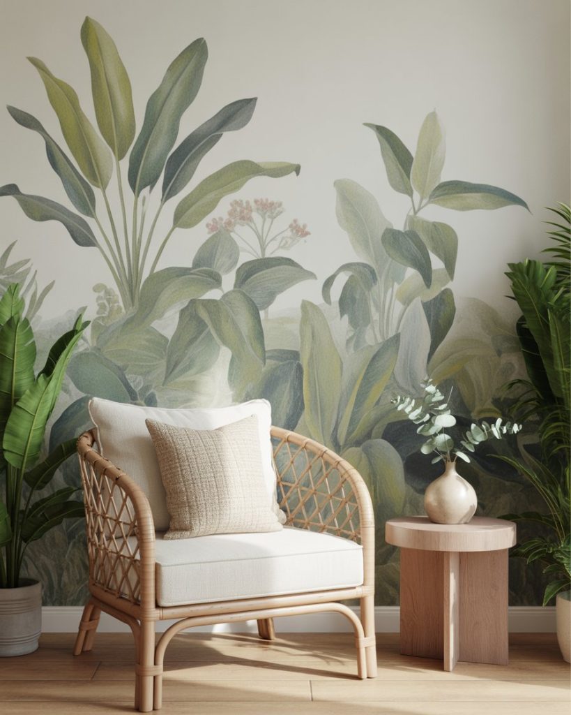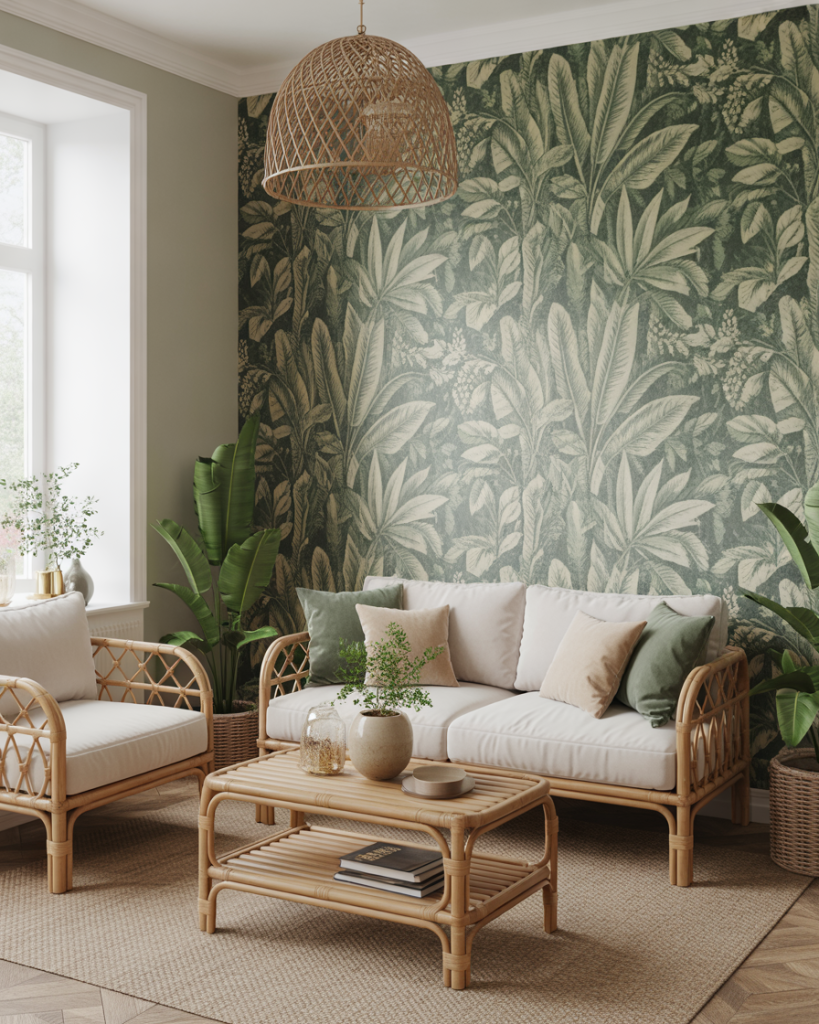 Bring the outdoors in by way of green botanical wallpaper, with the lush alternative providing freshness and movement behind a couch or reading nook. Ideal for coastal or nature-influenced walls, it pairs beautifully with rattan, plants, and light textiles.