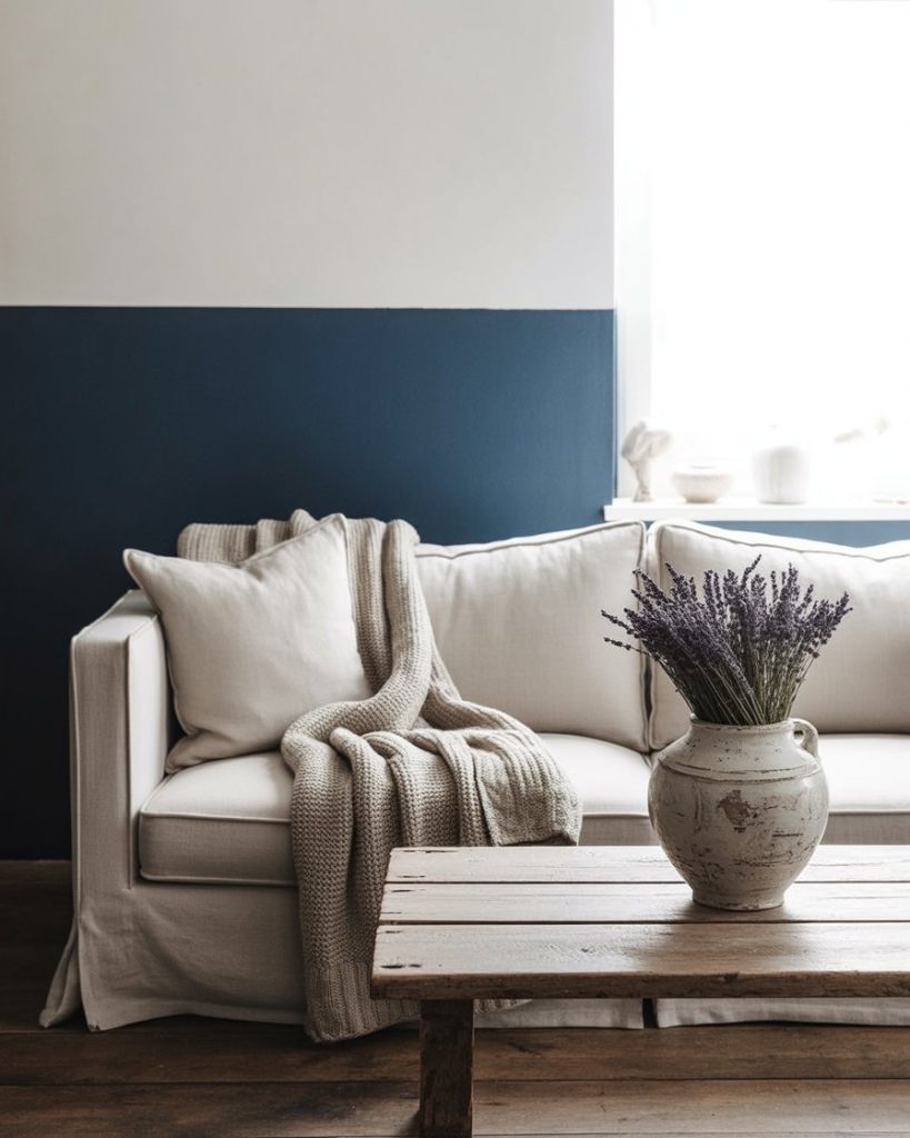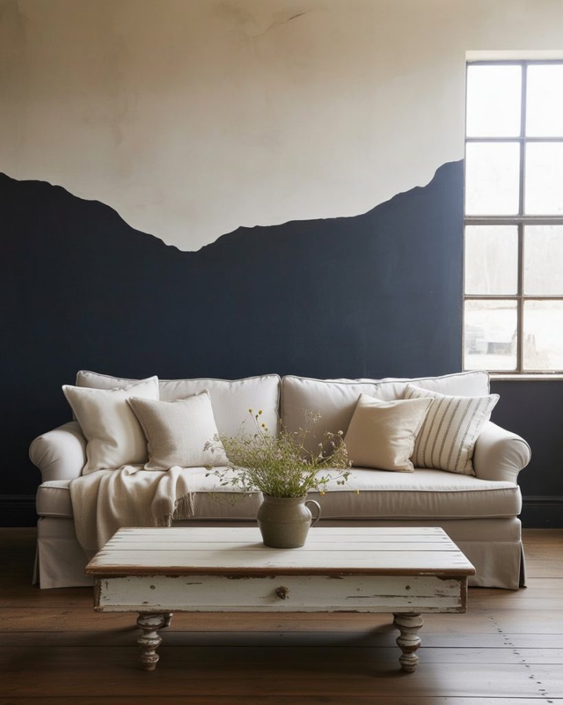 A two-tone wall elegantly divides a space while maintaining visual interest without clutter. There is a darker hue on the lower half and a lighter on top. Part of popular paint color palettes of farmhouse style, and it elongates walls while grounding furniture beautifully.