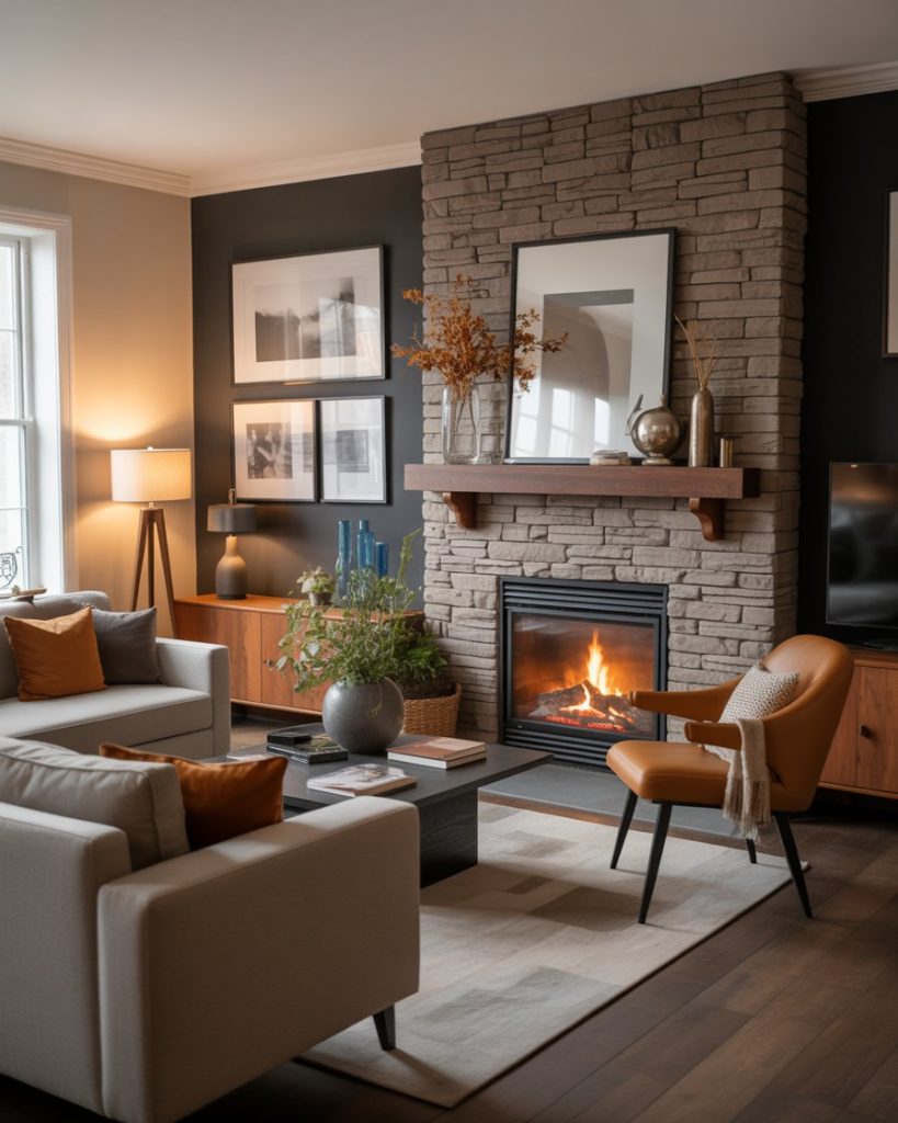 Combines stone, wood, and paint for a multi-layered accent wall. A fireplace framed in wood slats and painted above adds drama to high ceiling spaces. This blend of materials is ideal for 2026’s bold design personalities.