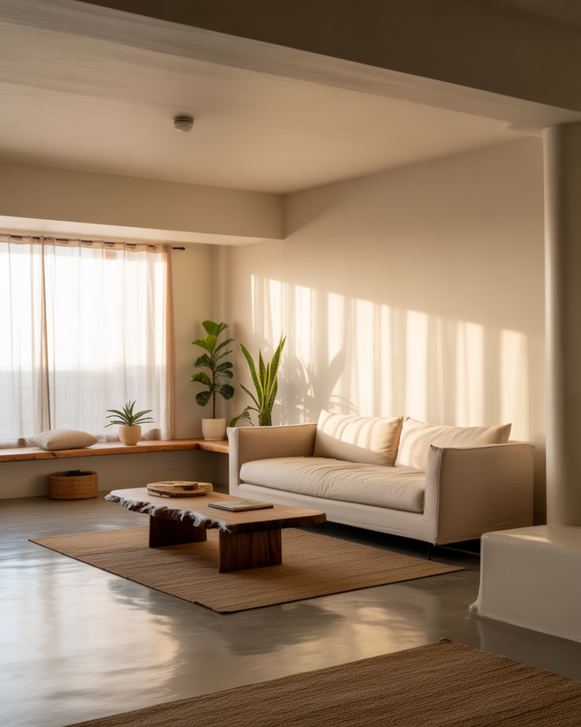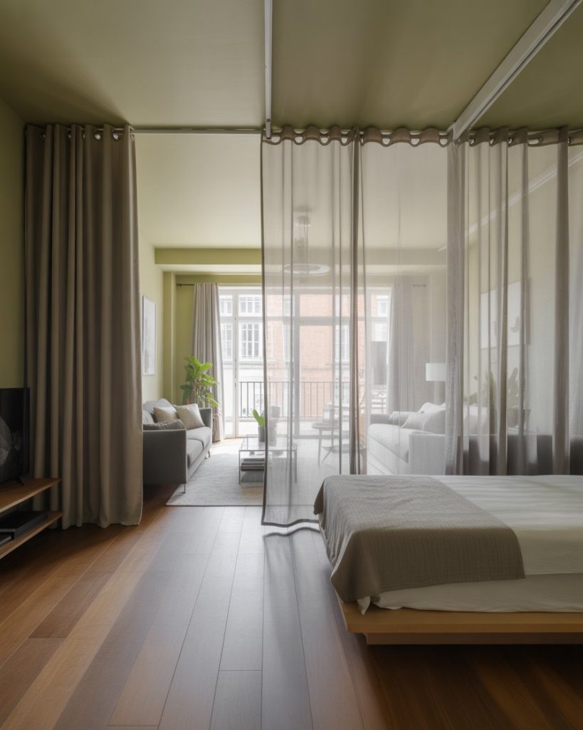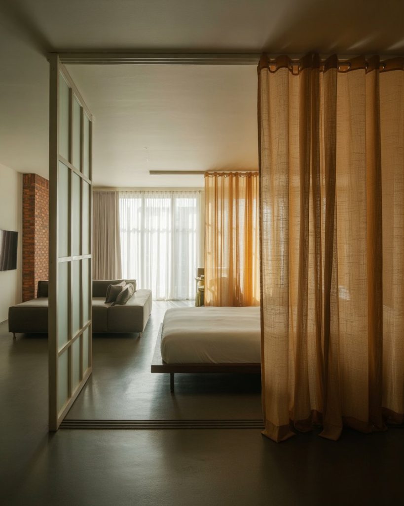 Open layouts in small studios or rented lofts can benefit from flexible dividers. Use curtains or sliding panels to separate your minimalist living room from your minimalist bedroom. Light fabrics maintain flow while giving privacy. This idea works well for couples who share compact spaces—it’s stylish, affordable, and fully reversible when the lease ends.