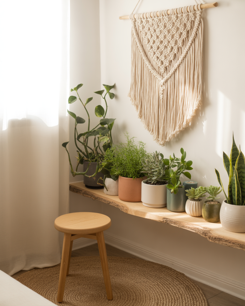 Bringing nature inside is one of the easiest rent-friendly decor ideas for a rental or small studio. Potted plants like pothos or snake plants thrive in low light and improve air quality. A boho or Scandinavian-inspired corner filled with greenery creates instant calm. For a minimalist living room, choose one tall plant in a sleek pot for a refined, modern touch. Nature softens edges and makes any apartment feel alive and cozy.