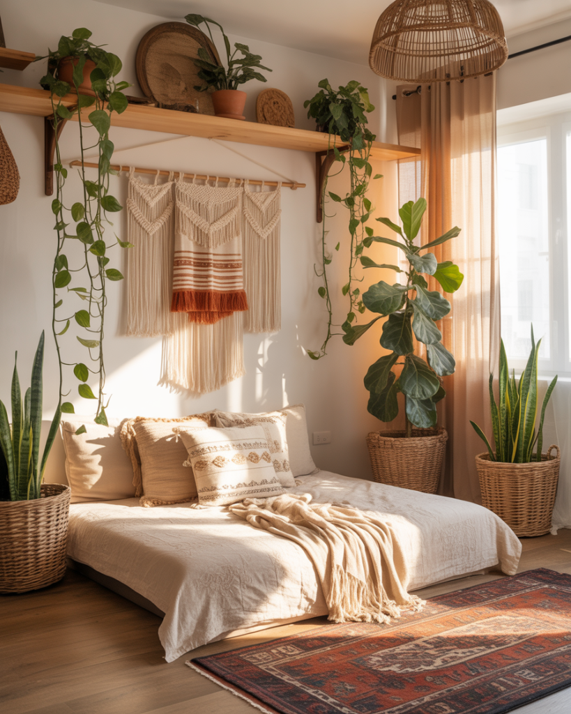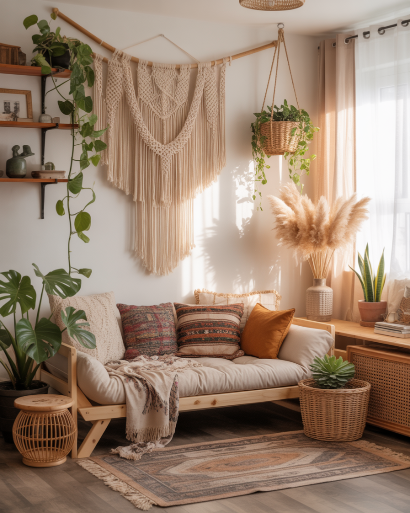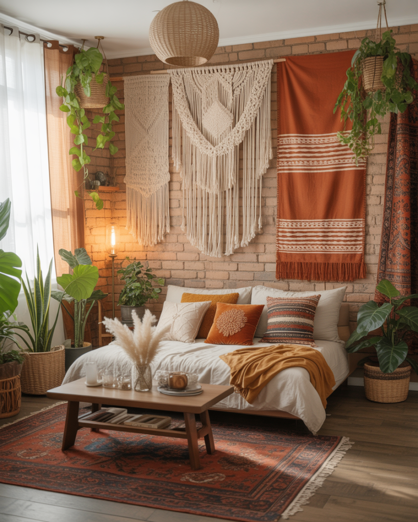 If you love color and culture, boho accents offer affordable personality. Woven baskets, wall hangings, and plants add natural charm to rent-friendly decor ideas. Even in small spaces, these details make a room feel layered and alive. Combine textures—macramé, rattan, and cotton—for a warm, cozy mood. As Apartment Therapy notes, boho remains popular because it’s personal, relaxed, and easy to adapt.