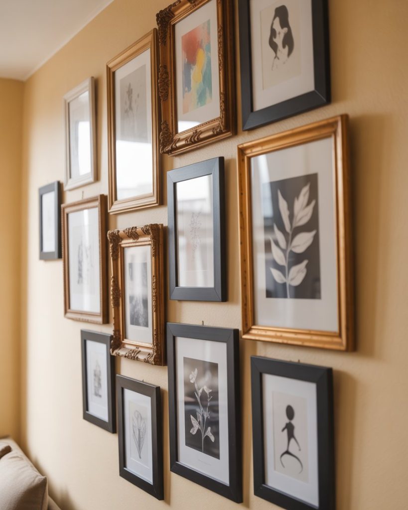 Adding affordable art or framed photos instantly personalizes a rented apartment. Create a gallery wall above your minimalist living room sofa or along a hallway. Mix vintage frames with modern prints for eclectic charm. Use removable hooks to stay landlord-friendly. This idea works great in college apartments where personality and comfort matter most.