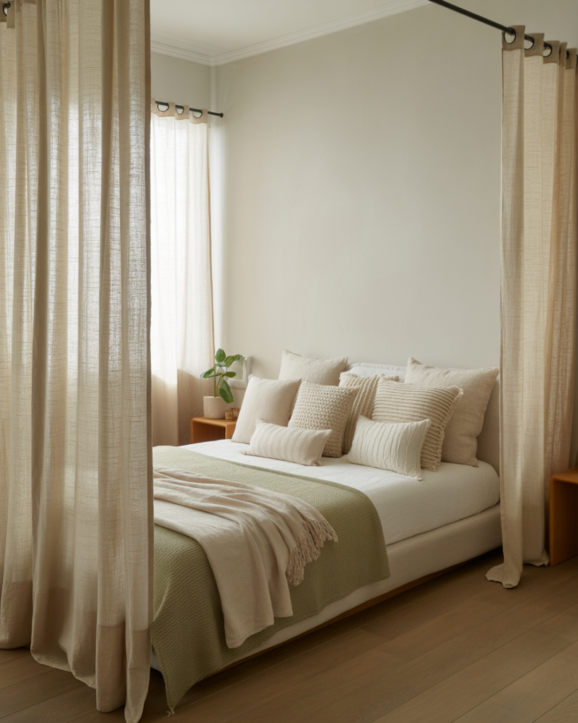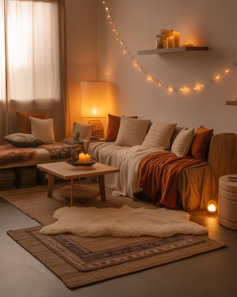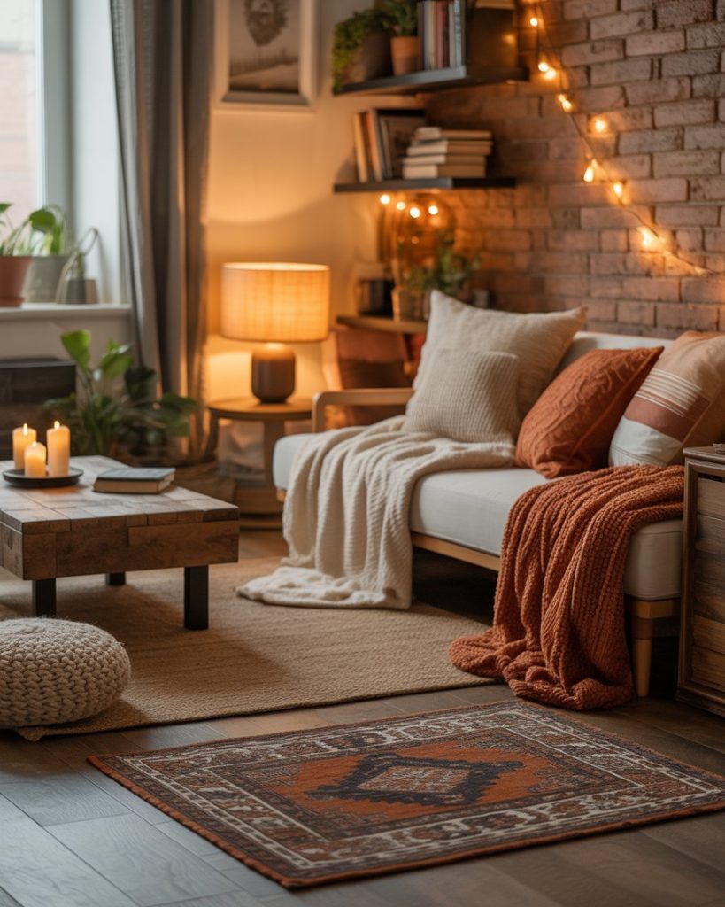 Fabric is the soul of a cozy home. Layer curtains, table runners, and cushions in linen, cotton, or wool to soften hard edges. Choose a boho rug for warmth or a Scandinavian-inspired plaid throw for balance. Even a neutral minimalist bedroom can feel inviting with tactile layers. Affordable textiles easily refresh your space each season.