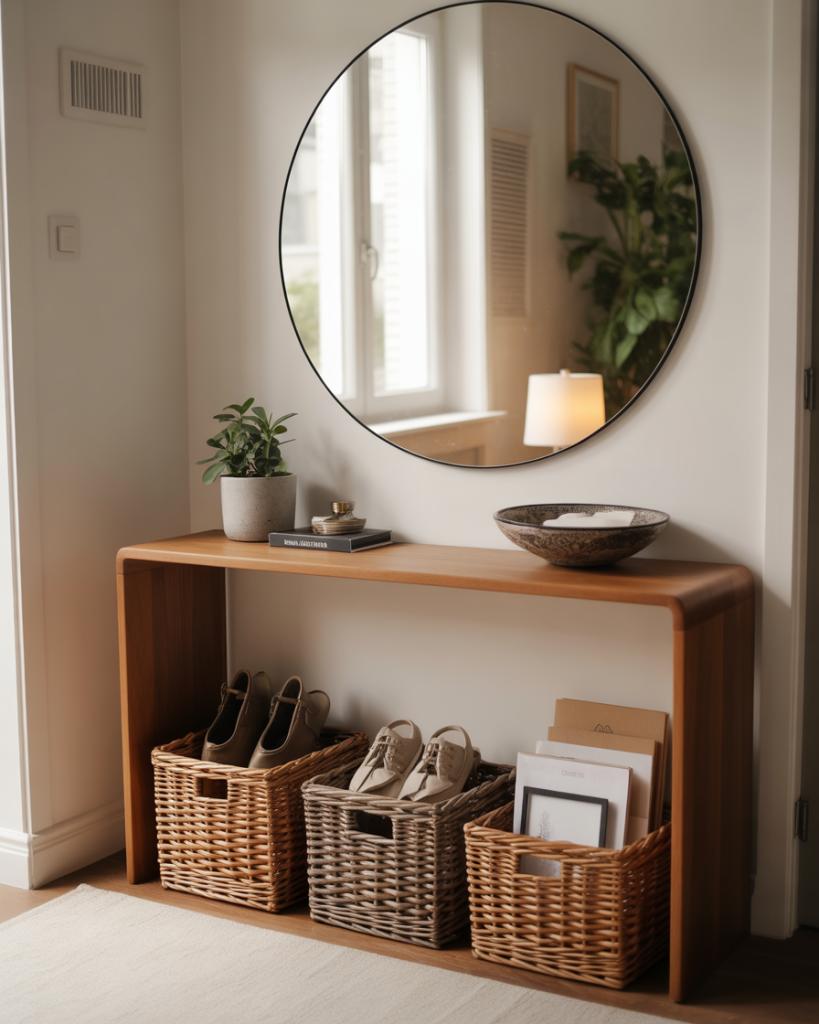 Even in a small studio or rented home, the entryway sets the tone. Add hooks, a slim console, and a small rug for a welcoming vibe. Incorporate creative storage solutions like baskets or shoe racks beneath a mirror. This functional yet decorative spot combines practicality and charm. Keeping it tidy aligns with minimalist principles and helps organize small-space living.