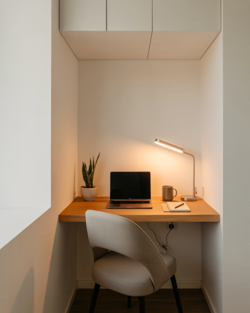 Remote work remains popular, so carve out a workspace—even in small spaces. A floating desk or a repurposed console can serve as your office corner. Keep décor minimalist and add a plant or lamp for motivation. In rented apartments, choose foldable or mobile pieces. This design idea suits college students and couples alike who need to share limited space efficiently.
