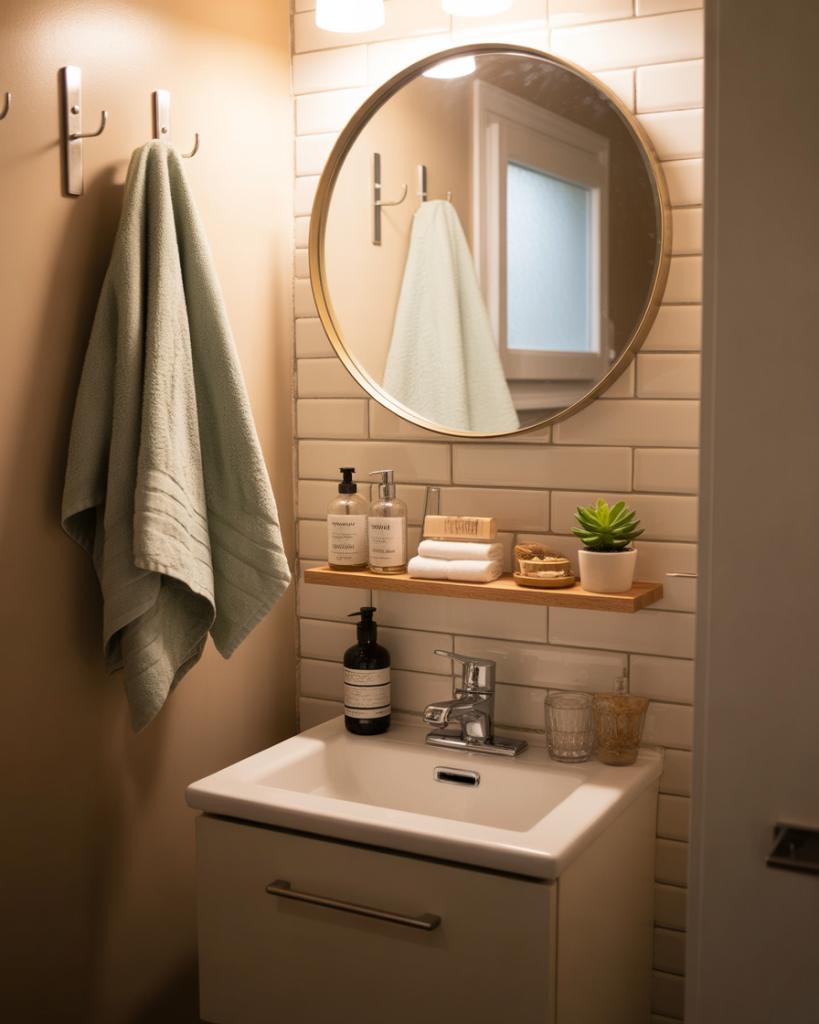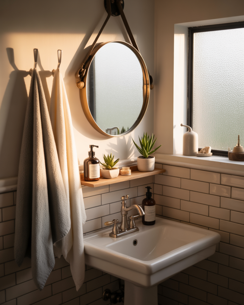 Design attention can even go to tiny bathrooms. Switch out hardware for brass or matte black, and add vintage mirrors and open shelving with baskets and jars for a more streamlined look. Stick-on tiles or vinyl flooring are easy, rent-friendly updates. In a small studio, these quick upgrades make daily routines more pleasant and reflect care for your surroundings without overspending.