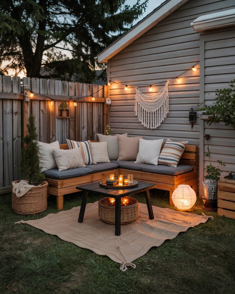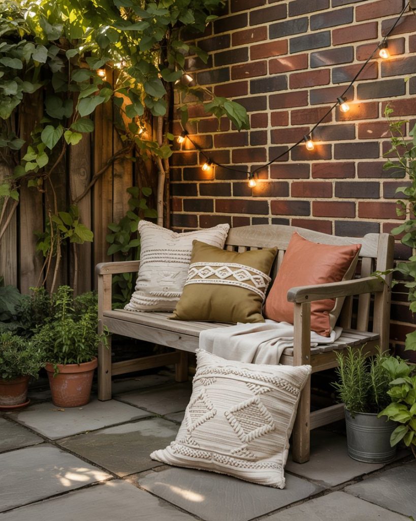 A cozy, simple bench nook layered with pillows turns even small yards into a personal hideout. Add string lights, thrift-store finds, and a side table for iced coffee, and you’ve got a spot that feels like a mini vacation. Great for renter-friendly layouts or anyone on a budget who doesn’t want construction drama.