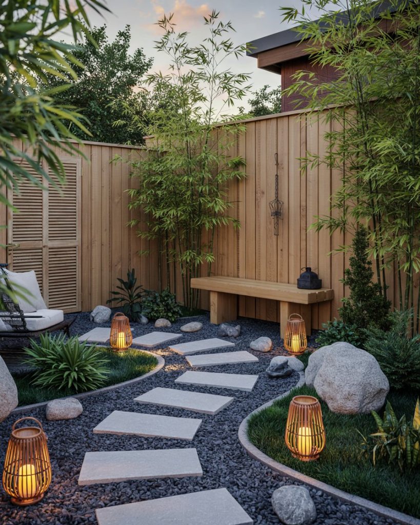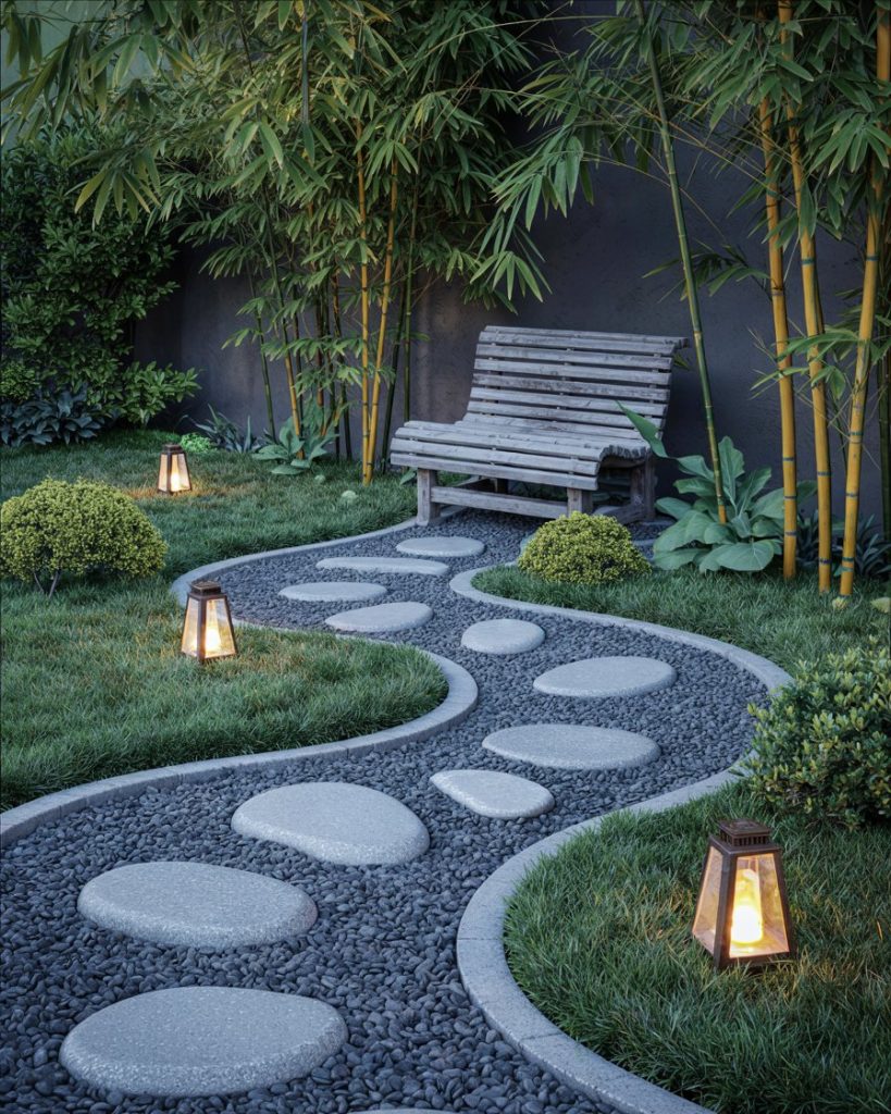 A relaxing gravel path with bamboo, lanterns, and a wood bench offers peace on a budget. Rain doesn’t ruin it, weeds barely try, and the sound of footsteps alone lowers stress. A favorite in humid states and minimal homes where calm matters more than grass.