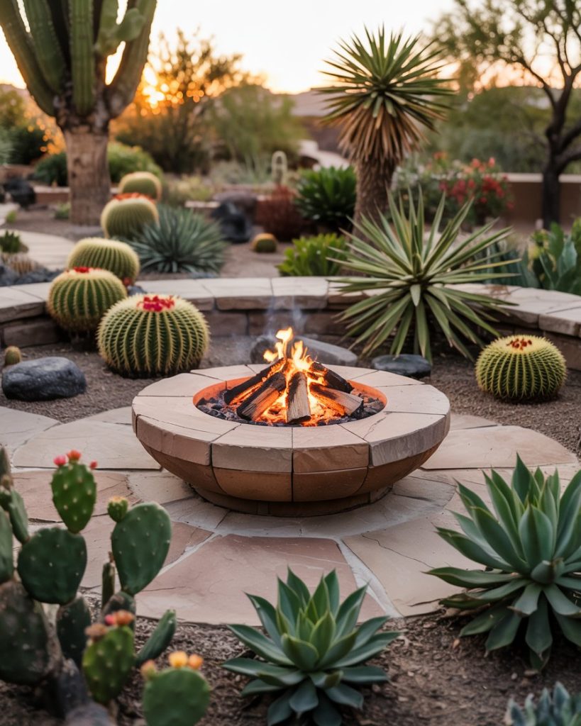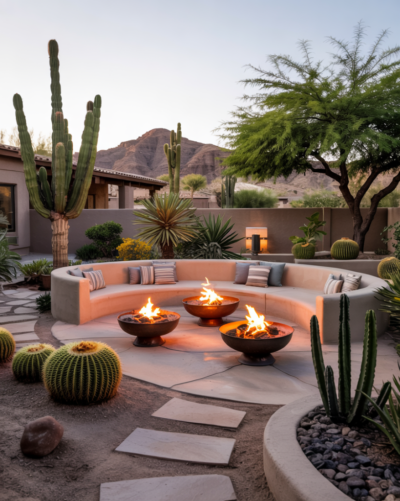 A modern Arizona-inspired yard uses sand-colored concrete, cactus gardens, and fire bowls instead of grass. This style celebrates the desert’s beauty and reduces water use. Add sculptural agave, sandstone benches, and string lights that glow at dusk—it’s minimal yet warm. Great for homeowners in dry regions or anyone craving a sun-baked, relaxing atmosphere year-round.