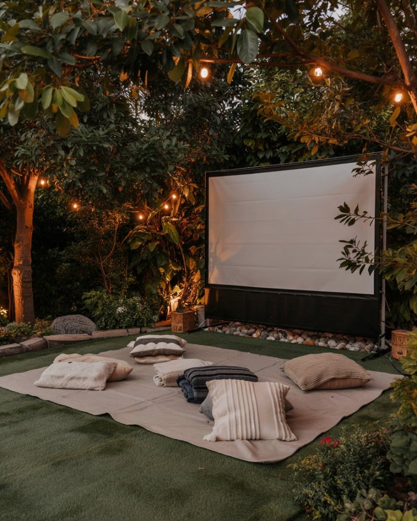 Homeowners and renters alike love creating cool movie nights with projectors, turf flooring, and layered blankets. Use a simple white sheet on a fence, add wireless speakers, and you have a movie night under the stars. Great for families, date nights, or neighborhood get-togethers.