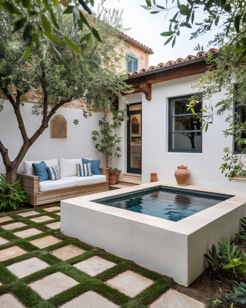 Compact Mediterranean plunge pools are replacing large pools in 2026 backyard designs. Surrounded by limestone tiles and olive trees, they evoke coastal Europe while fitting in tiny or narrow lots. With white stucco walls and blue accents, this style feels effortlessly luxurious without taking up space or overspending.