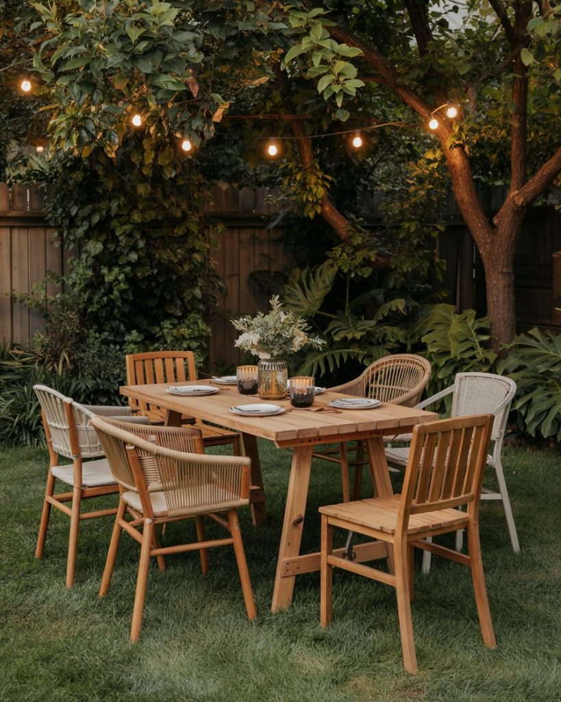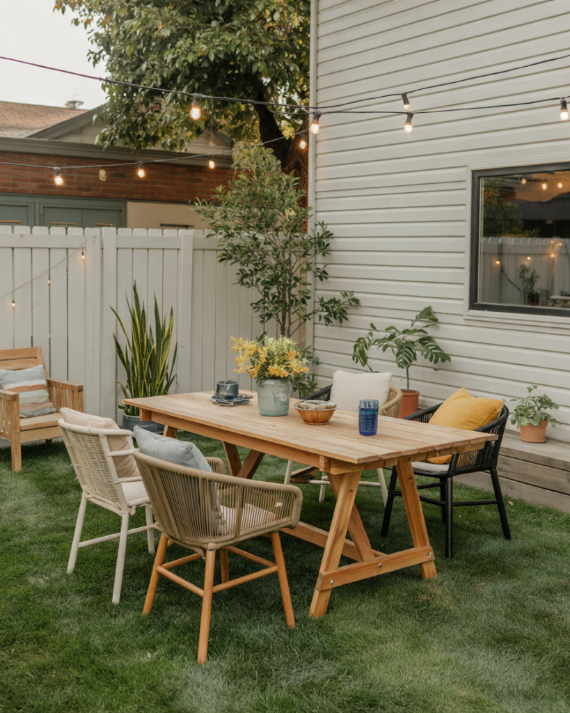 A simple yet functional dining area set on turf creates a soft underfoot feel for barefoot dinners. Add a wooden table, string lights, and mismatched chairs for a laid-back vibe. It’s cheap, low-maintenance, and ideal for renter-friendly homes that want elegance without installation.