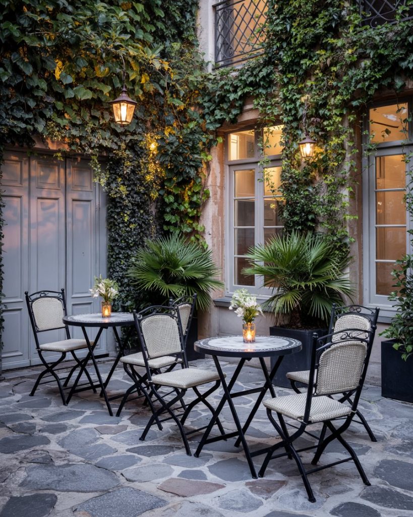 A European, grassless courtyard relies on stone pavers, limewash walls, and one sculptural tree. It’s low-water, low-noise, and totally renter-friendly. Think quiet espresso mornings, not lawn mower afternoons. A top choice for patios in drought regions and older brick townhouse yards.