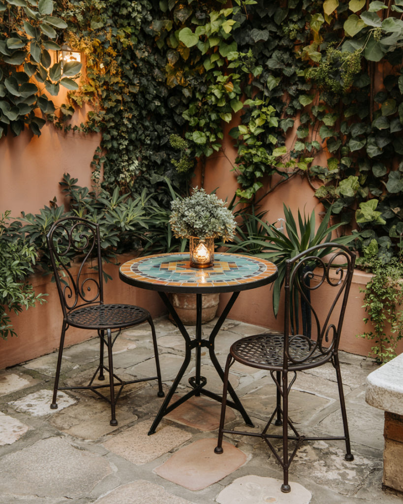 If you want to create a nice atmosphere of a European wine, the stone floor for this space is a great start. Decorate with a shut lantern, a table with mosaic designs, metal chairs, and climbing ivy for that European bistro feel. This space does feel very intimate and cultural, making it great for a quiet night dinner with friends or a morning espresso.