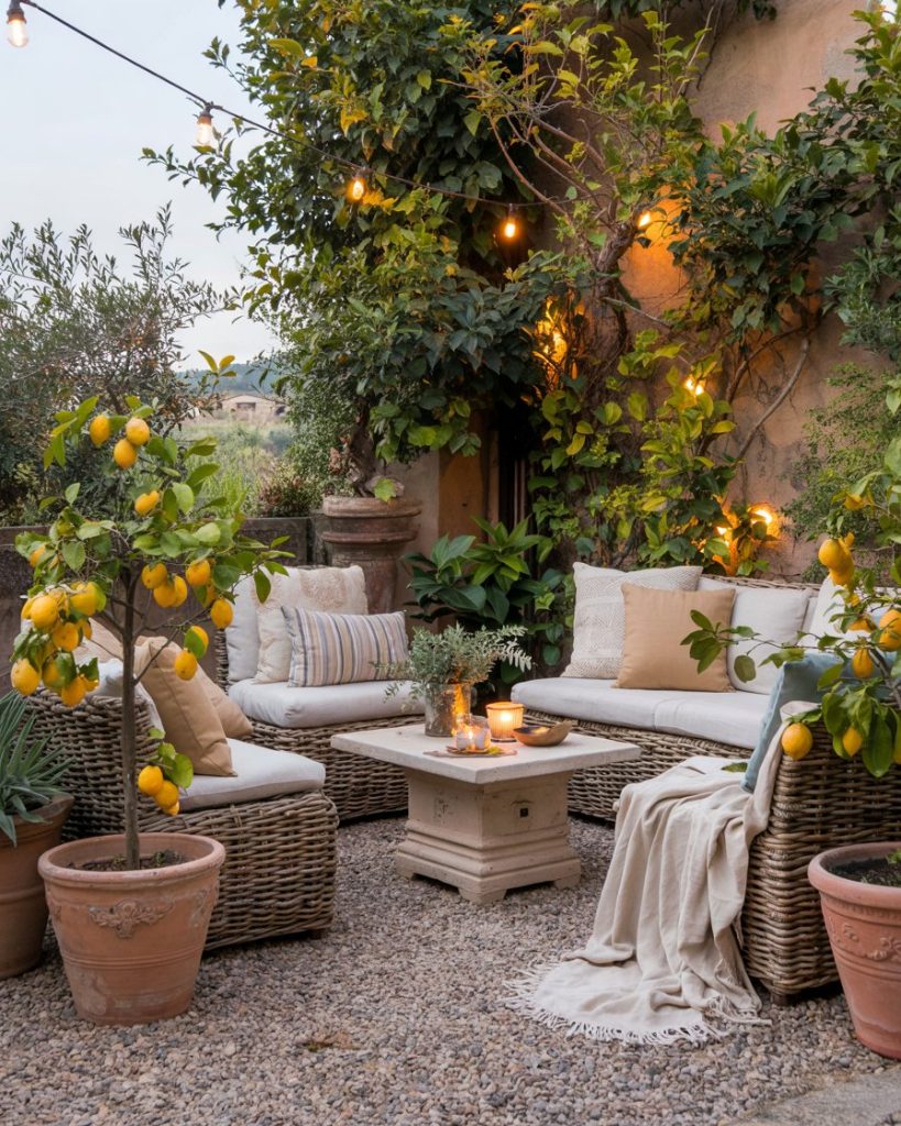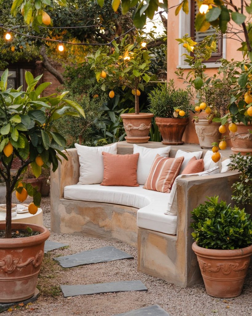 An Italian-style gravel lounge merges rustic comfort with vintage romance. Picture curved benches, citrus trees in clay pots, and linen pillows under soft lighting. It’s elegant yet simple, making any outdoor space feel like a Tuscan retreat. Perfect for a budget remodel or renters craving Mediterranean charm.