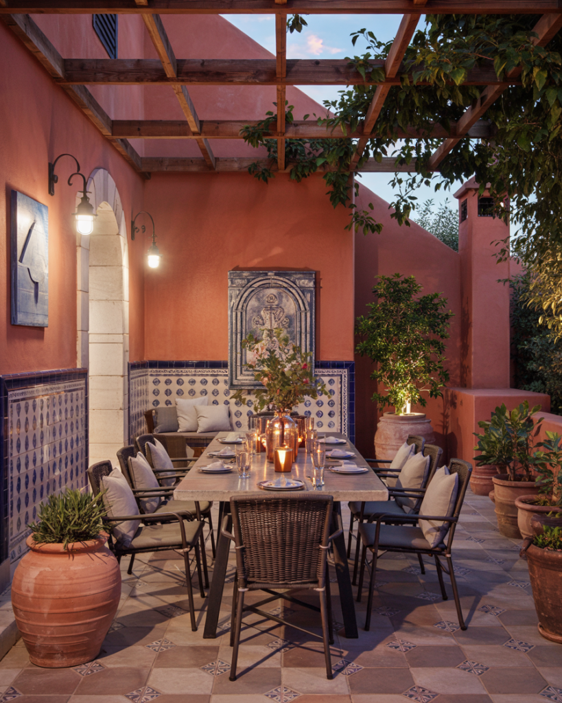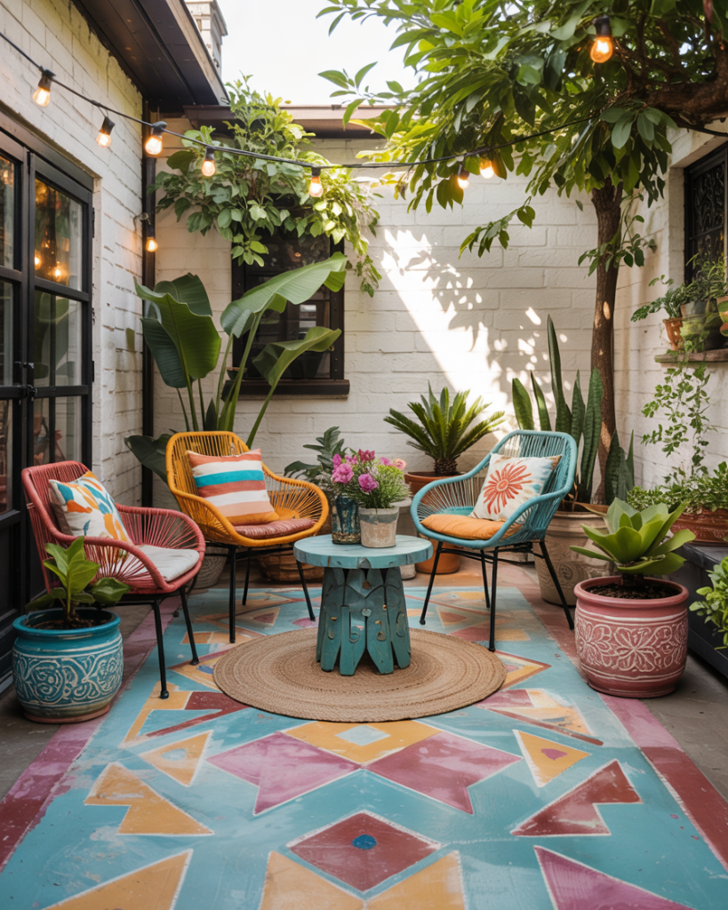 A colorful patio rejects beige and celebrates mismatched chairs, painted concrete, and flea-market pots. It’s expressive, forgiving, and Instagram-ready. As Justina Blakeney says, “Color is confidence you can sit on.” Ideal for creatives, renters, and anyone allergic to bland.