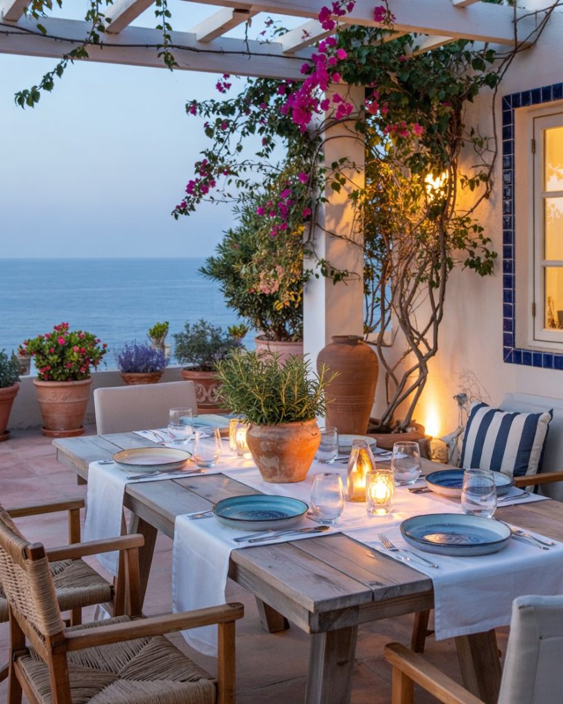 A Mediterranean setup turns the yard into an open-air dining room with terra-cotta pots, blue tile, and iron chairs. Shade sails beat heat, while long tables invite late dinners “nonna-style.” Works beautifully in hot states and gives even new builds a soul that feels decades old.