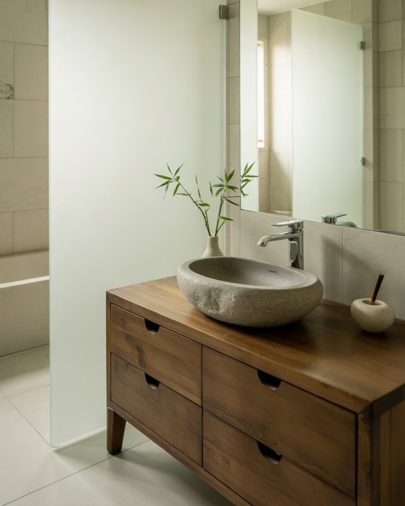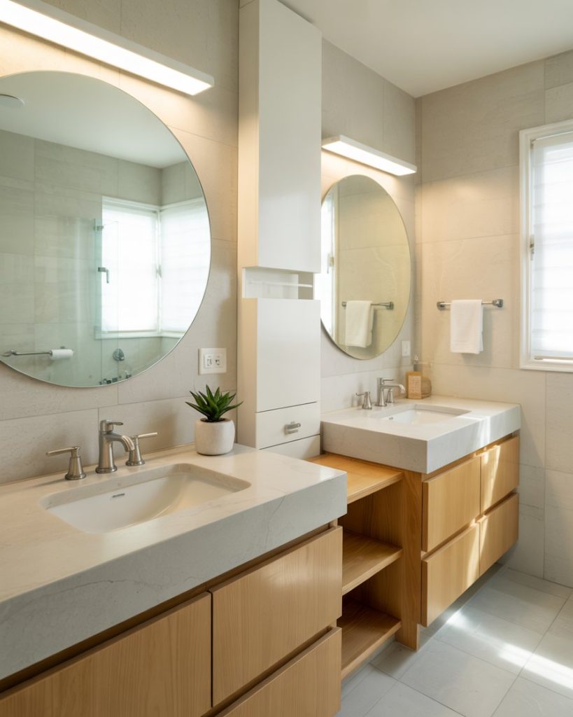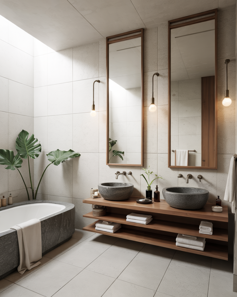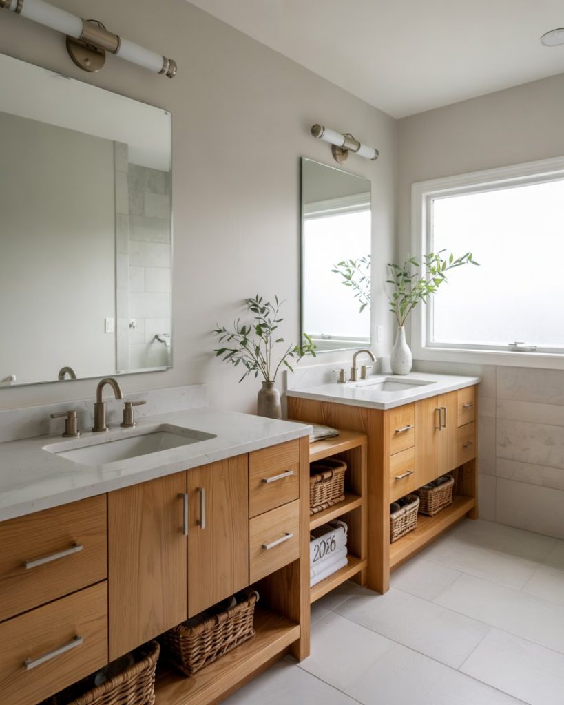 A primary bathroom in 2026 focuses on mindfulness and flow. Inspired by Japanese minimalism, it blends stone basins, wood panels, and neutral hues to form a serene rhythm. Hidden storage and soft lighting enhance the meditative vibe. Ideal for couples seeking balance and calm amid a busy lifestyle.