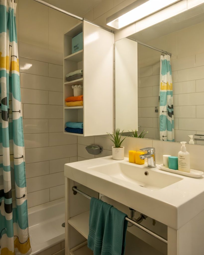 The compact, practical dorm bathroom design of 2026 is redefining functional design. Ideal for small apartments or co-living quarters, this design makes use of vertical storage, folding accessories, and resilient materials. Youthful and playful energy is added with blue and green, and in tight spaces, clever use of mirrors and lighting can create the illusion of space by doubling it.