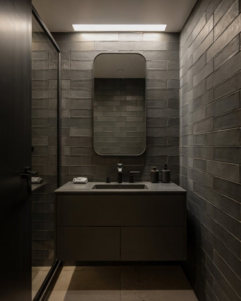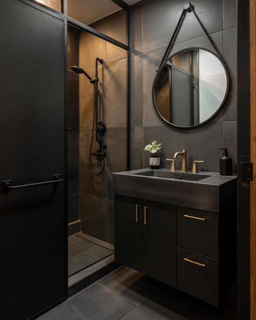 A small half or tiny bathroom can feel surprisingly elegant in full black. Matte tiles, slim fixtures, and hidden lighting turn compact areas into design showcases. Add white towels or wood accents for contrast. Influencers like Chris Loves Julia suggest black bathrooms add instant architectural weight and luxury—especially when paired with natural finishes.