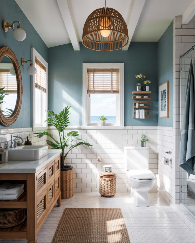 Blue remains a top trend in 2026 for its calming, oceanic energy. Whether deep navy or soft sky, it suits modern and rustic interiors alike. Combine with light oak or rattan for coastal appeal. This style works beautifully in guest or Jack and Jill bathrooms where serenity and freshness are key.