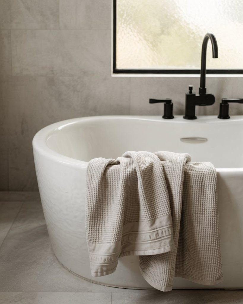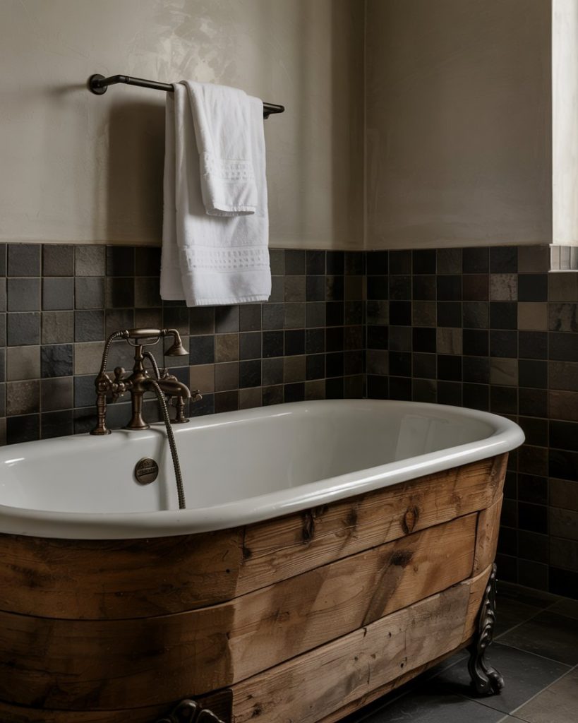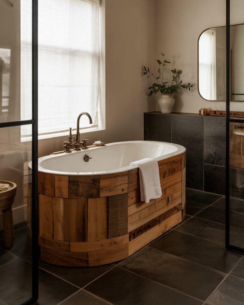 The warmth of reclaimed wood in a rustic style with the cool, sleek metal of modern design in a bathroom is a beautiful combination. This style thrives in both cottages and suburban homes, celebrating craftsmanship and texture. Depth is created with exposed beams, woven baskets, and bronze fixtures. Balanced black accents keep it modern and grounded. Designers are saying rustic is rough—it’s the tactile comfort and authenticity.