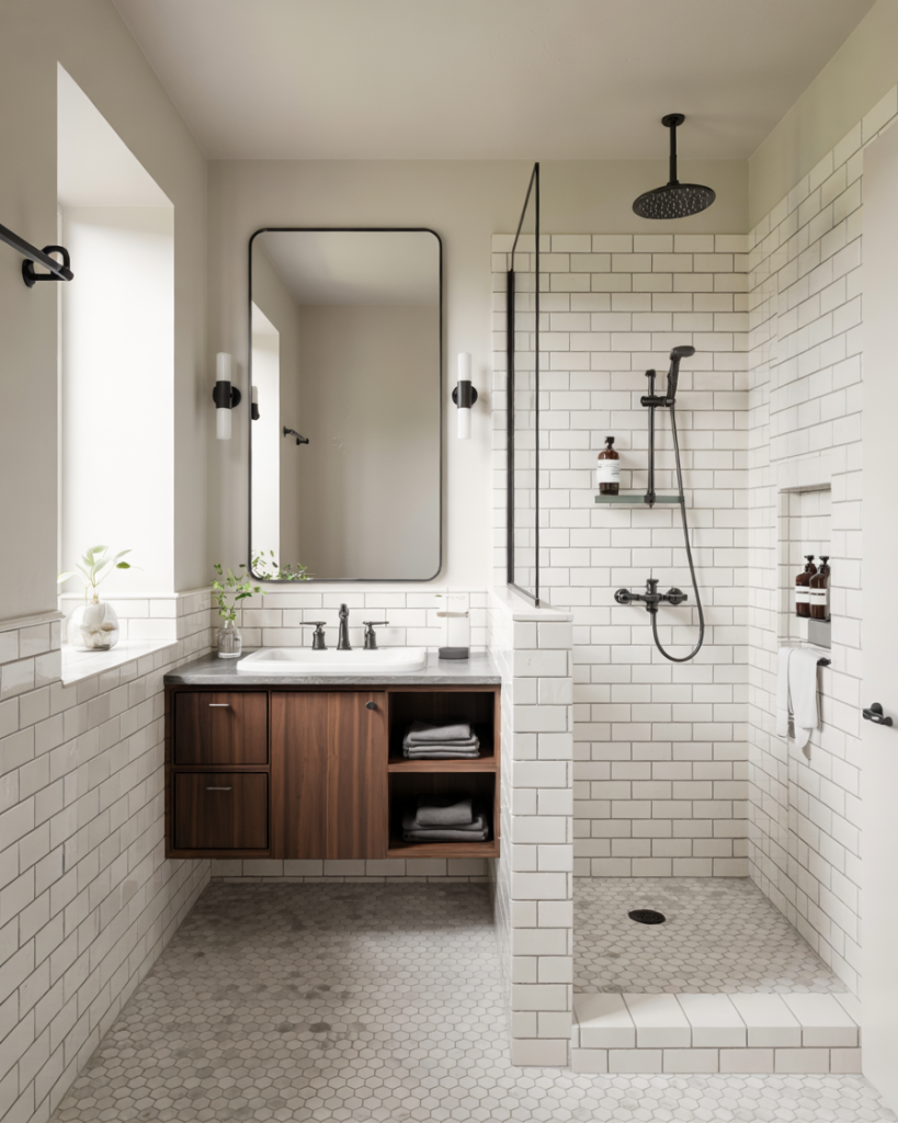 For city apartments or older homes, a tiny bathroom can still feel open and luxurious. The key is multifunctional design—sliding doors, compact sinks, and vertical shelving. Reflective surfaces and light-colored finishes expand the sense of space, while matte black and white fixtures bring contrast. As noted in 2026 trend forecasts, the “micro-spa” approach transforms limited square footage into a soothing retreat.