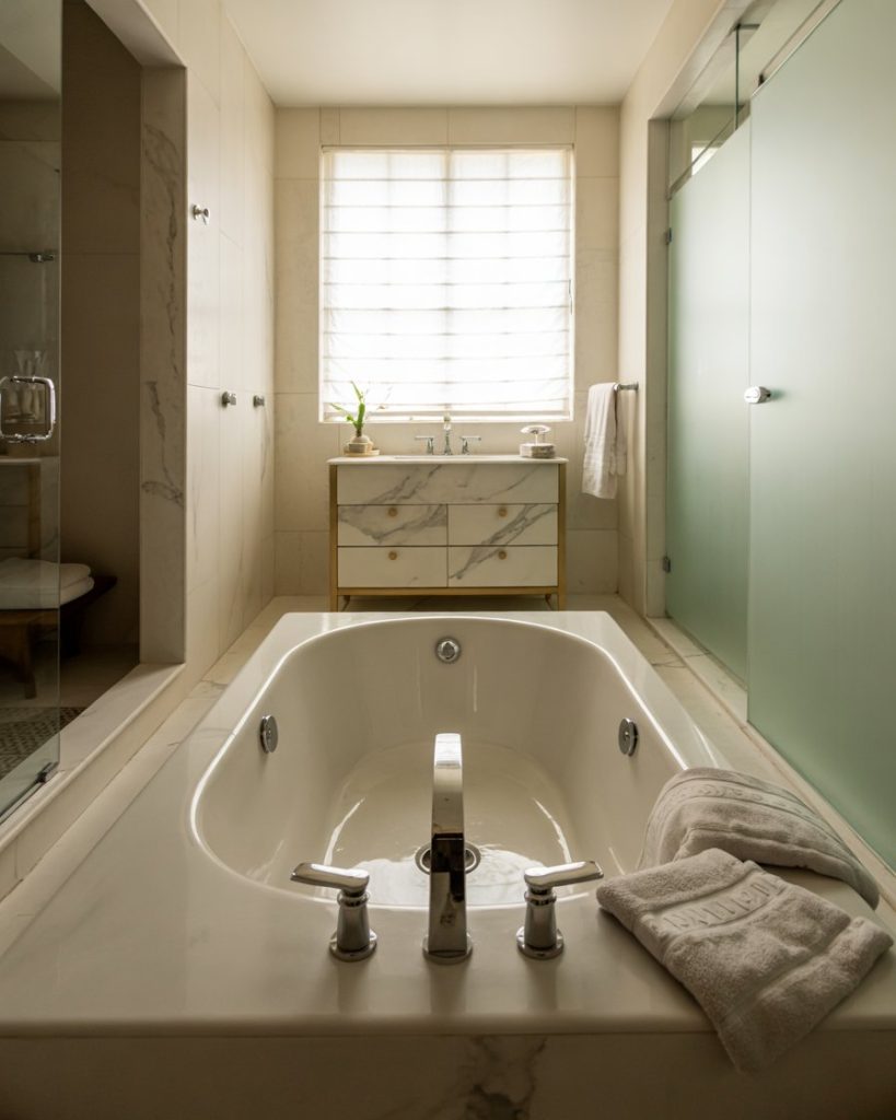 Nothing feels cleaner or more refreshing than an all-white bathroom. In 2026, designers update this classic with layered textures—porcelain, marble, glass, and linen—to prevent sterility. Add subtle black hardware or greenery for depth. The result is a bright, timeless look that adapts to any decor evolution.