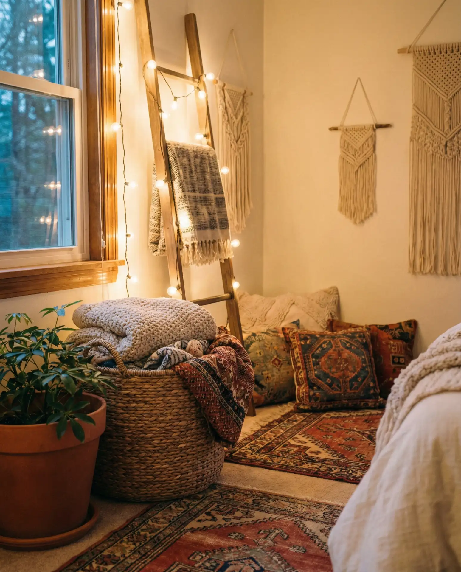 A bedroom in the attic filled with bohemian charm is irresistibly cozy. Layer with patterned textiles, green plants, and woven furniture to construct an artistic hideaway. The aesthetic thrives on imperfection-mismatched fabrics and vintage finds. Ideal for tiny or small rooms where creativity overrides space. Soft light and rattan decorations are must-haves to keep it welcoming and laid-back.