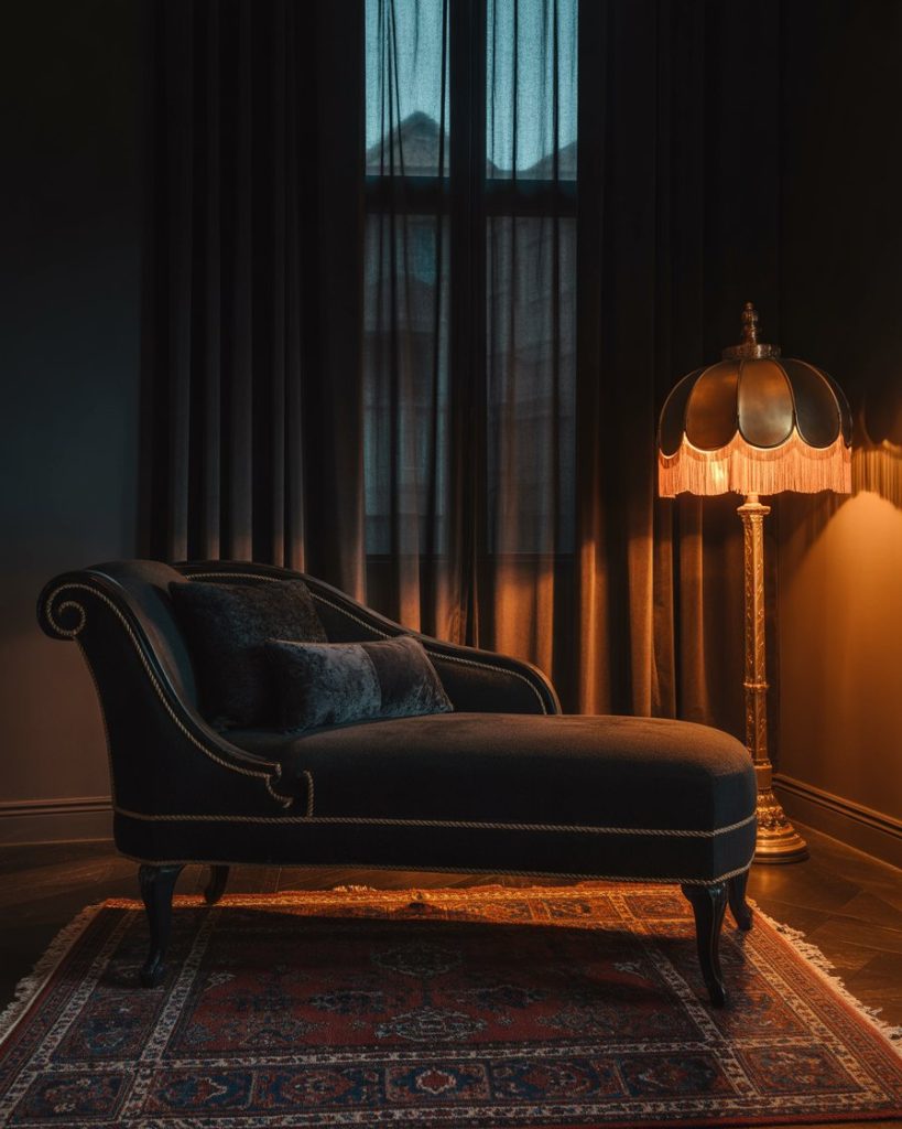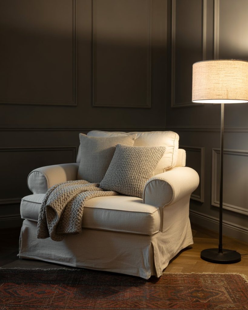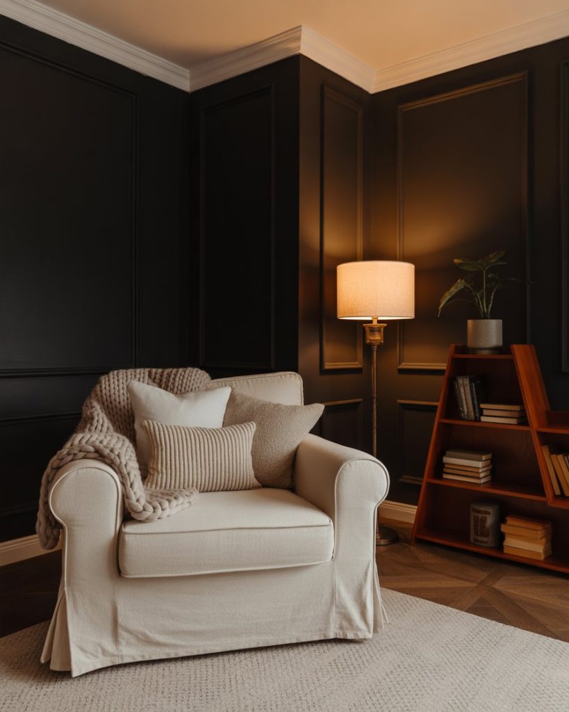 ID47] To retain the cosiness vibe, balance the shadows with amber warm lighting and plush soft fare on the rusty side. Luxuriously sensual modernity.