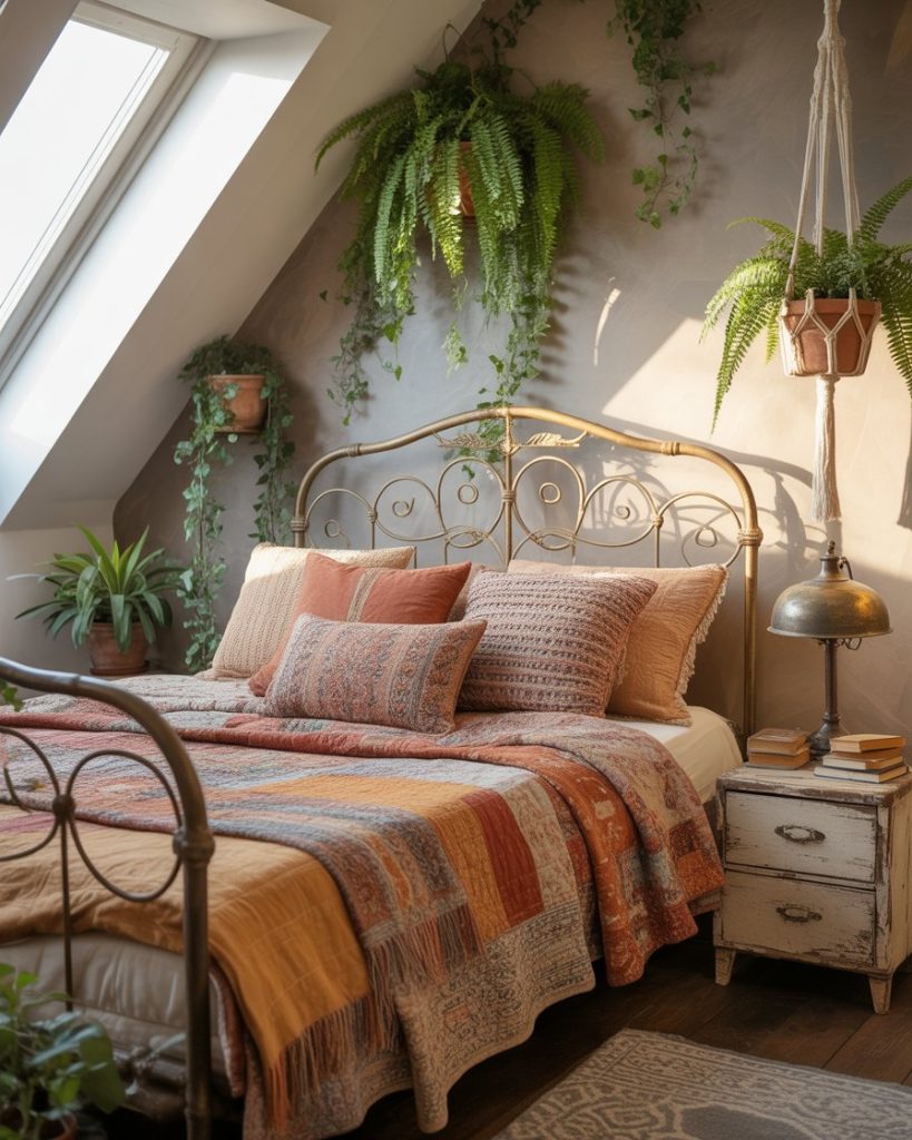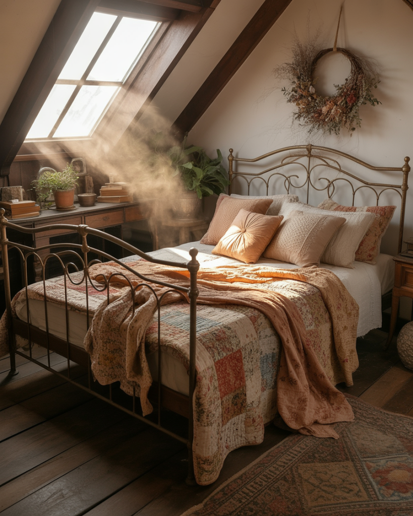 A bedroom in the attic filled with bohemian charm is irresistibly cozy. Layer with patterned textiles, green plants, and woven furniture to construct an artistic hideaway. The aesthetic thrives on imperfection-mismatched fabrics and vintage finds. Ideal for tiny or small rooms where creativity overrides space. Soft light and rattan decorations are must-haves to keep it welcoming and laid-back.