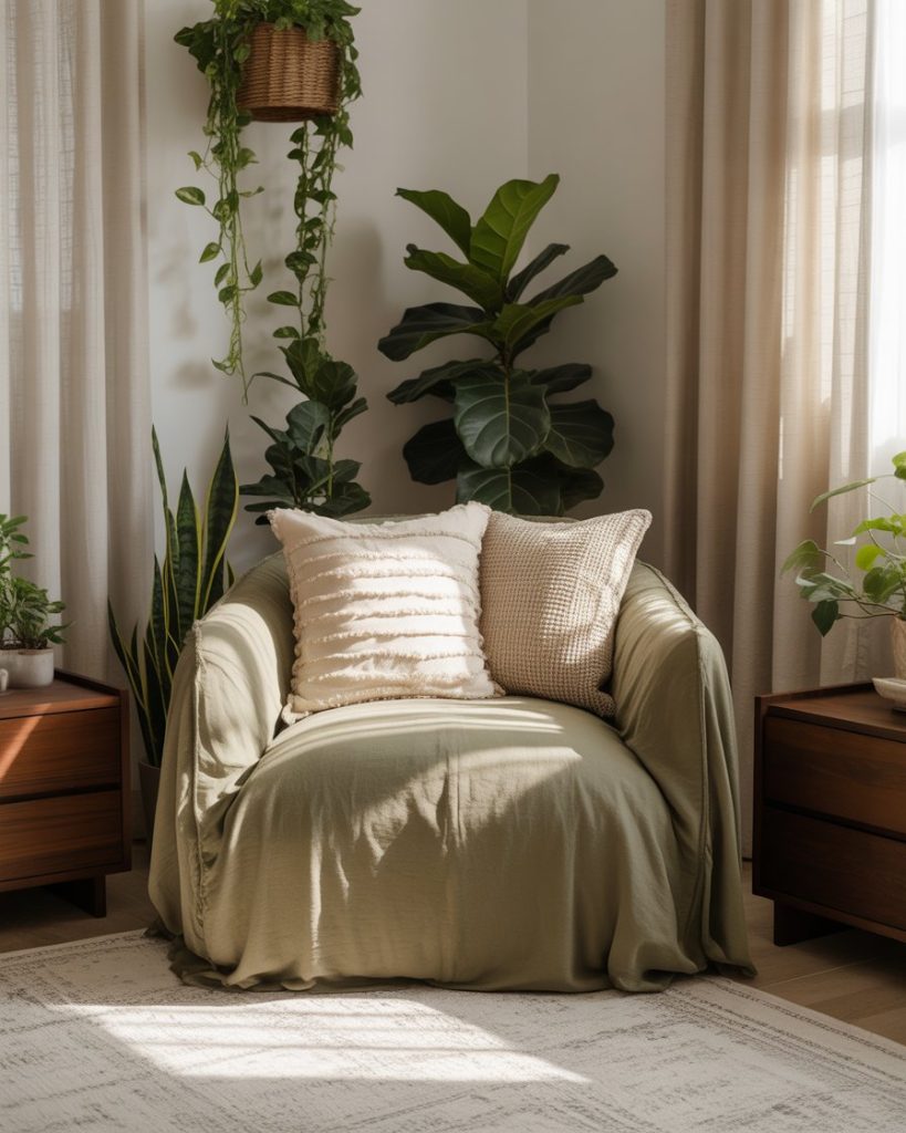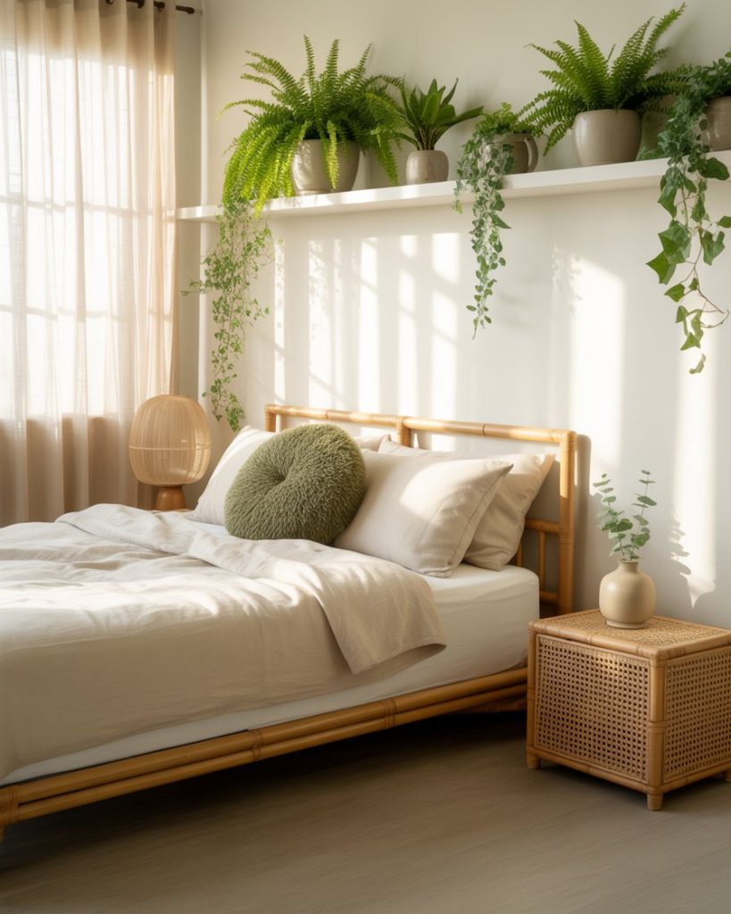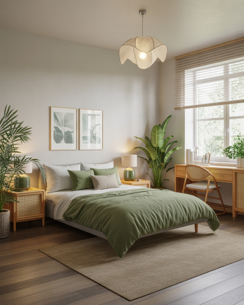 Blending green design and sustainability, this idea uses natural fibers, bamboo, and recycled wood. Perfect for small rooms, it creates a breathable, cozy environment that feels alive. Add white walls and natural fabrics to enhance calm. It’s both eco-friendly and elegant — perfect for a guest room that nurtures wellbeing.