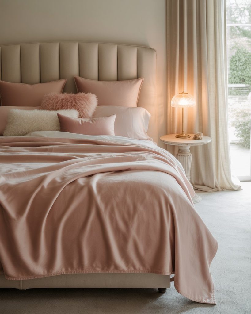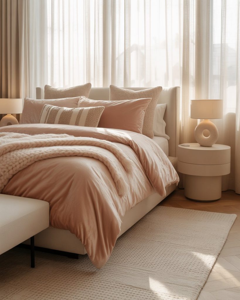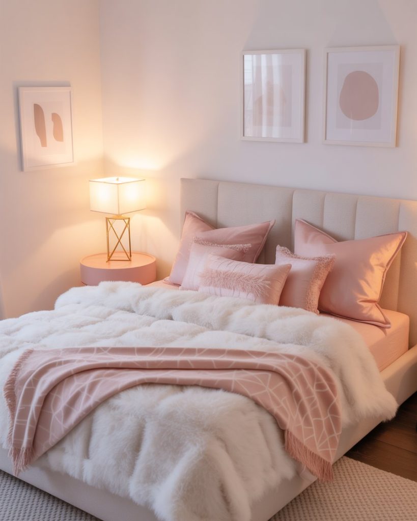 Shades of pink, white, and brown create a romantic retreat out of any bedroom. Developed for couples, this idea creates cosiness through soft bedding, candlelight, and smooth fabrics. Gold or matte black-filmed accents give the look an air of modern sophistication, working wonders for a master or guest bedroom while remaining warm and intimate without feeling overbearingly sweet.