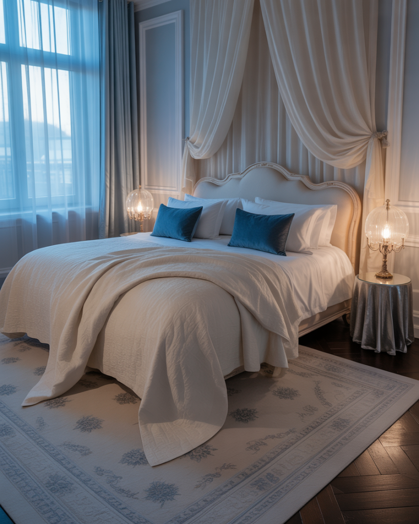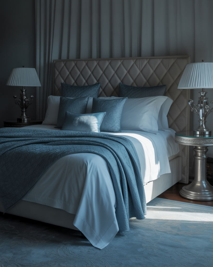 Blue in this style is serenity itself. Combined with white bedding, grey drapery, and faint sprinklings of silver, it forms an ambience of cozy romance for the two. It is a soft moonlight embrace, calm enough for waterside mansions, and somewhat lavish for soft urban dens.