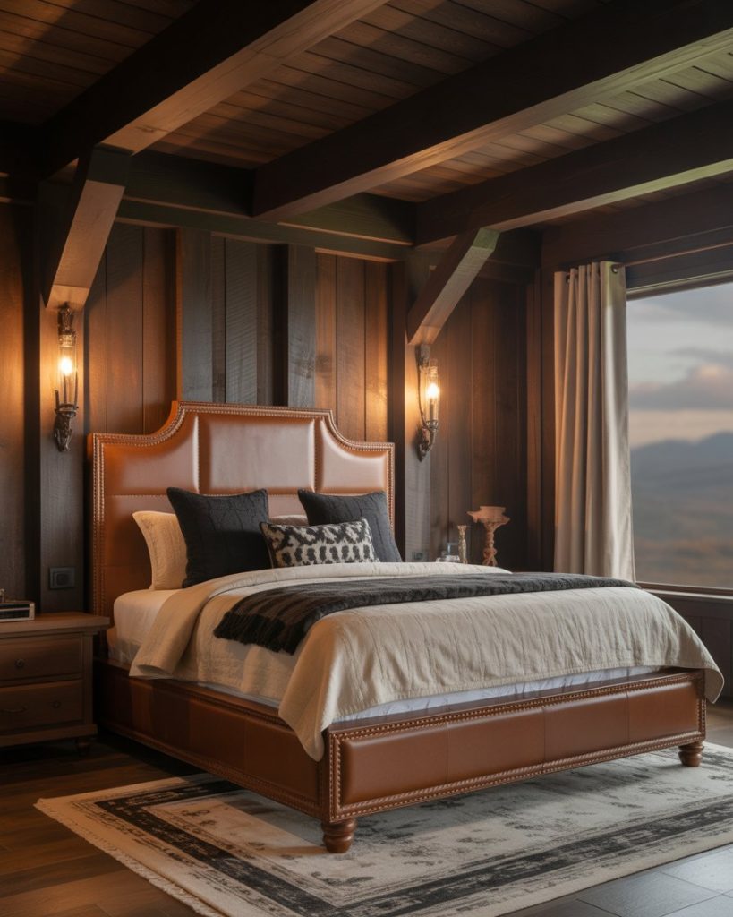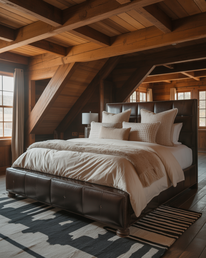 Brown leather, reclaimed wood, and black and white details layer this interior oft-wildly with western ranch home inspiration, coining it cozy yet refined: Rustic wrangling has been touch-and-go with modern-day edginess. Fit to throw any sort of battle of styles between with natural textures and earthen colors of the western guest or main bedroom, which, in general, is so authentically charming. A vintage rug or an iron light fixture brings with it an understated level of drama.