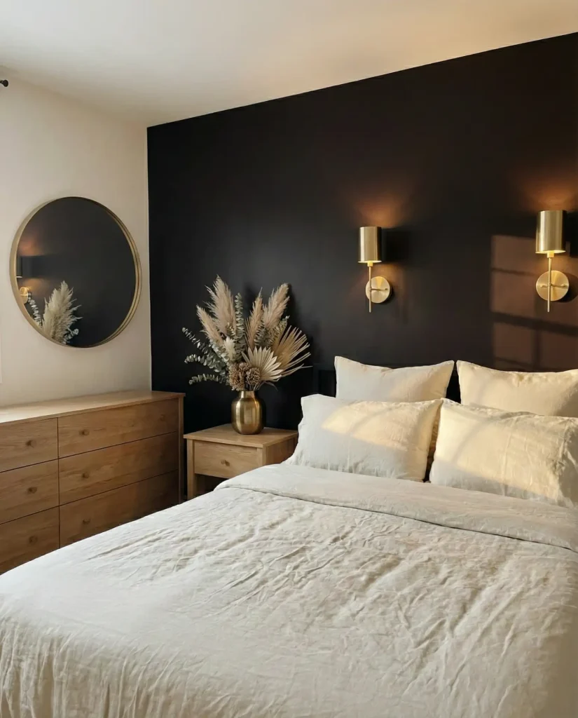 If you’re looking for inspiration that feels both timeless and current, the matte black and brass combination is impossible to ignore. There’s a reason this palette keeps reappearing on every major design platform—it’s warm without being heavy and luxurious without being pretentious. Brass sconces, gold-toned picture frames, and brushed metal hardware all glow beautifully against the deep dark of a black accent wall. It’s a palette that works in every room size and translates well across nearly any bedroom style, from minimalist to maximalist.