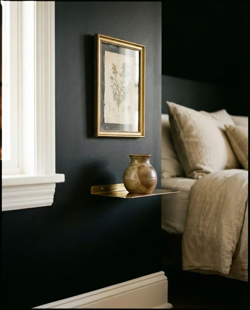 Floating shelves on a black accent wall turn the space into something that feels both personal and gallery-worthy. The dark backdrop makes every object on the shelf—a ceramic vase, a stack of books, a small sculpture—feel like it was intentionally curated. This is a great approach for bedrooms where you want to showcase meaningful decor without cluttering nightstands or dressers. Keep the shelving minimal: one or two shelves with three to five objects total will always outperform a fully loaded gallery wall in terms of visual impact and design sophistication.