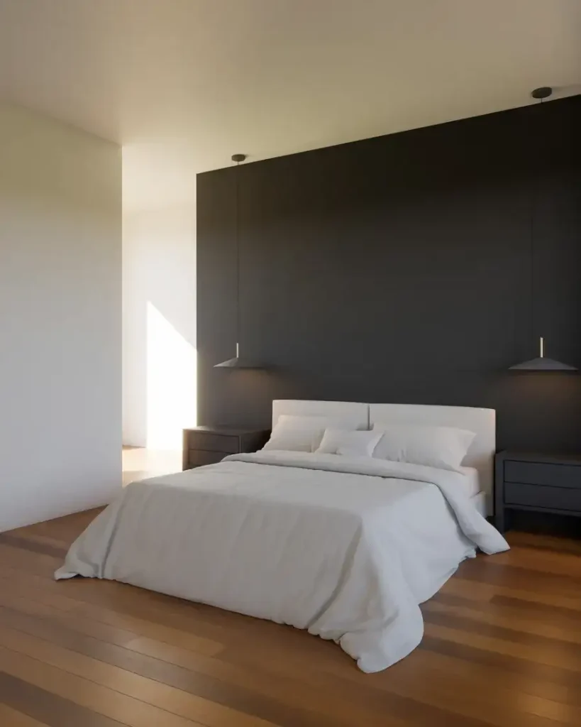 For anyone not ready to commit to four black walls, a single accent wall is the most approachable entry point into dark bedroom design. Painting just the wall behind the bed in a deep charcoal or matte black creates an architectural moment that frames the bed like a piece of furniture worth looking at. The rest of the room can stay light—white or cream walls, warm natural wood—and the contrast becomes the entire design conversation. It’s also a smart furniture decor idea strategy: the dark wall makes the headboard feel more intentional, even if it’s simple.