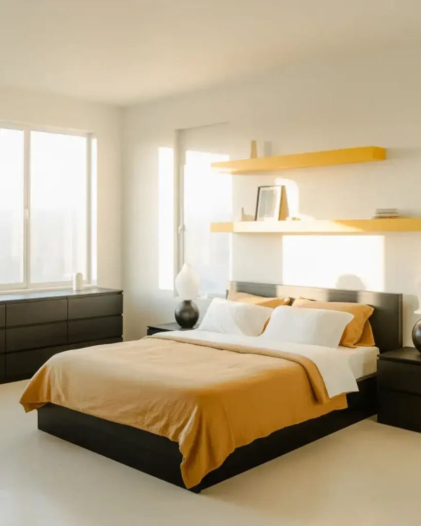 Black furniture against light walls is the entry-level version of the black bedroom—and it’s not a lesser version, just a different conversation. A matte black bed frame, black dressers, and black nightstands against white or warm cream walls give you all the drama and contrast of a dark room without any of the commitment. This approach is ideal for renters or homeowners who aren’t ready to paint and works especially well as furniture decor ideas in light-filled, south-facing bedrooms where you want graphic contrast without blocking out the light.