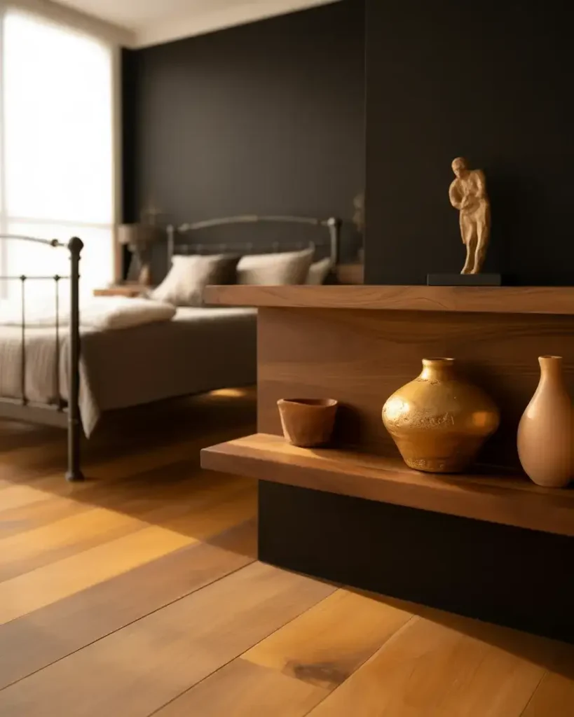 One of the biggest misconceptions about black bedrooms is that they skew cold. When you pair black with brown and natural wood tones—walnut, oak, chestnut, or teak—the room immediately shifts into warm, organic territory. A black platform bed sitting on a rich walnut hardwood floor, flanked by honey-toned wood nightstands, tells a completely different story than the same bed against white walls. The natural warmth of wood is the antidote to any concern that black will make a room feel like a cave.