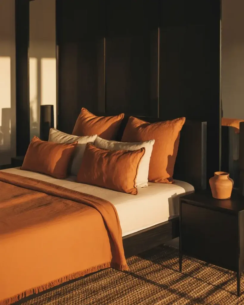 Few color combinations feel as viscerally autumnal and warm as burnt orange and black. In a bedroom, this palette channels the best of southwestern design, mid-century modernism, and contemporary organic warmth all at once. A matte black bed frame with terracotta or rust-orange linen pillows, a deep amber rug, and adobe-toned accessories creates a room that feels like October all year long. This is not a combination you see everywhere yet, which makes it a real opportunity for a bedroom that stops the scroll when it ends up on Pinterest.